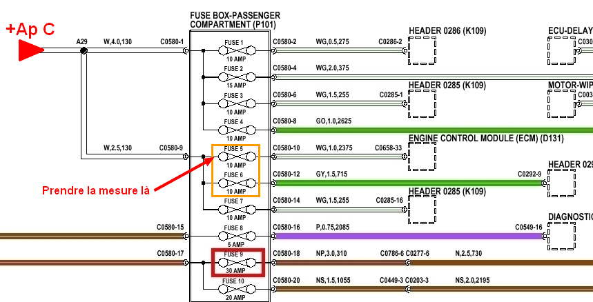 Comment t'es tu repiquer sur le fusible 9 de 30 A, Avant le connecteur marron C0786 caché derrière la tôle support de fusible.