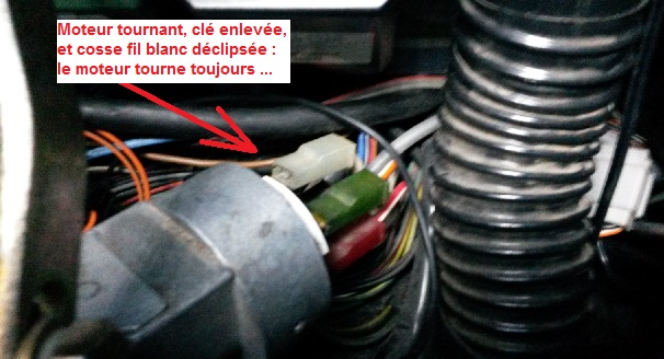 As tu également essayé de débrancher le fil blanc liseré orange en plus du fil tout blanc, moteur tournant clef enlevée? Il sert a l'alimentation des accessoires en position 1 de la clef.