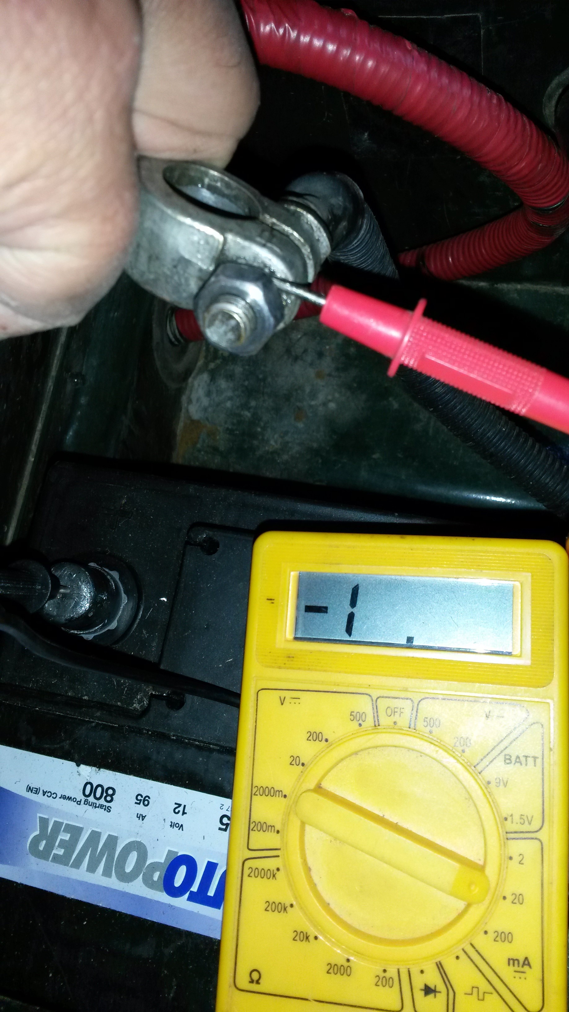 mesures de tension aux bornes de la batterie, sonde rouge sur le + et noir sur le - en position V, calibre 20V continu.