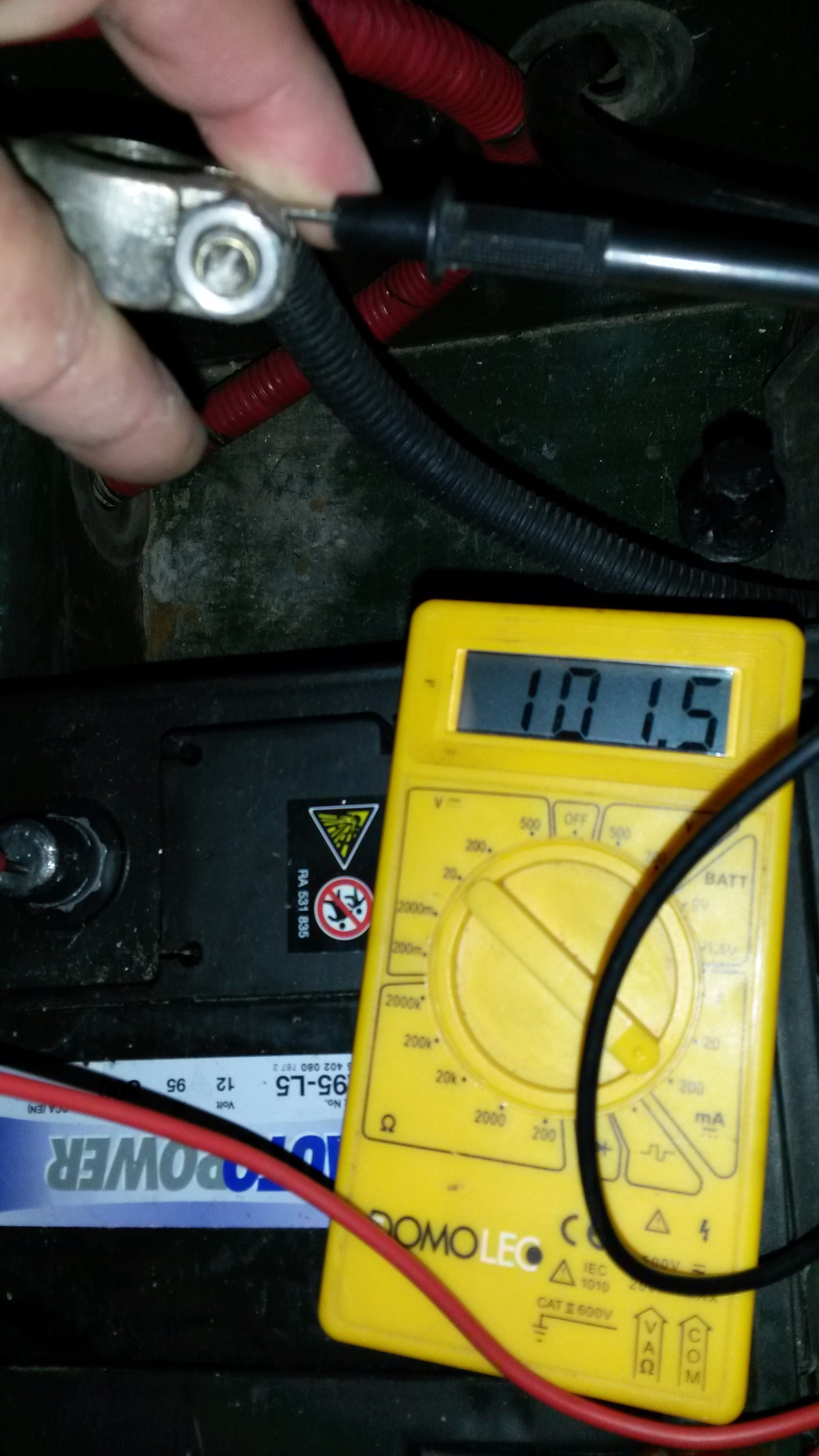 Juste comme ça en passant, ton ampèremètre a des trop petits calibres, pour faire une mesure sereinement en courant, il va de 2mA à 200mA max, c'est à dire 0.2A, ce qui pour l'automobile est vraiment trop peu, pour ne pas risquer de détériorer l'appareil. Sur la photo tu es sur le calibre 20mA probablement que l'appareil t'indique un dépassement, c'est à dire que le courant que tu veux mesurer est plus fort que 20mA. D'autre part il t'indique un "moins" 1, comme tu peux le voir sur ta photo, tu as inversé les bornes de l'ampèremètre, la sens de circulation du courant étant théoriquement du + vers le - c'est la borne rouge du multimètre que tu positionnes sur le plot de la batterie et la borne noire sur la cosse de la batterie. Ce n'est pas grave en soit avec un appareil numérique, avec un appareil à aiguille celle ci serait partie à fond dans le mauvais sens, là il te l'indique en affichant le - .
