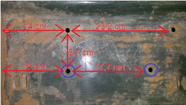 Et les dimensions des trous figurant au fond de l'emplacement sous le siège conducteur (vérifiez sur le vôtre que les trous sont au même endroit ...)