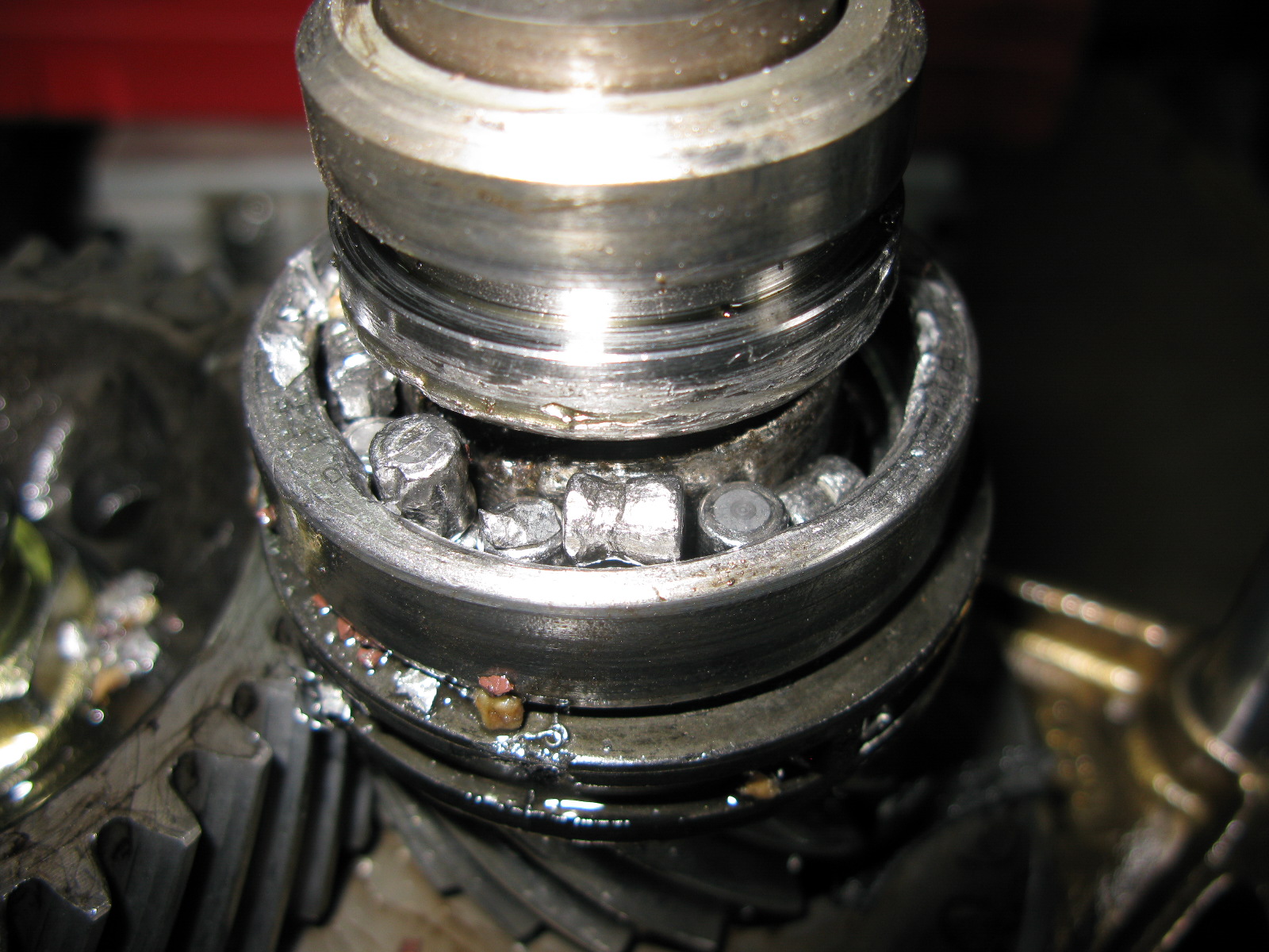 Roulement de sortie explosé, la bague d'huile a probablement tourné, l'huile est sortie par là où elle pouvait.