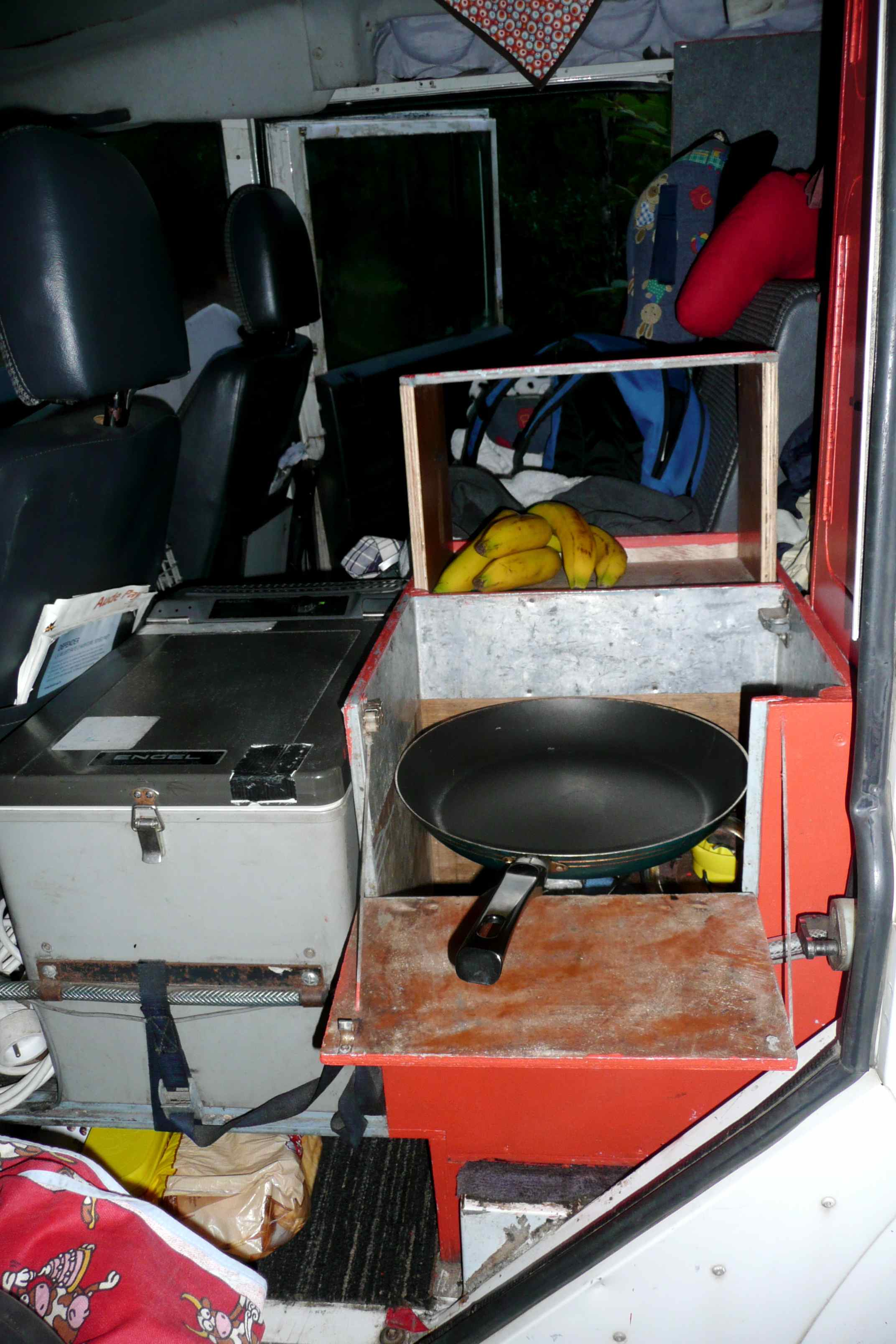 On voit sur la dernière photo un robinet...C'est celui de la "cuisine". Ce robinet est alimenté par une pompe branchée sur le panneau solaire, panneau qui alimente également la lampe que l'on aperçoit également sur la photo, ainsi que le frigo Engel et un convertisseur 12/220.