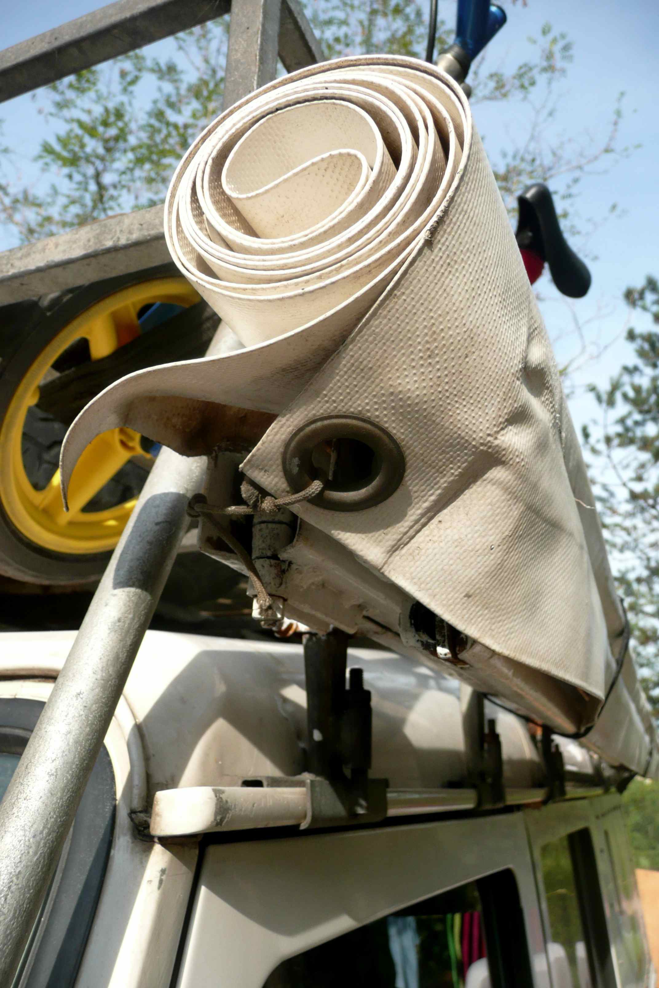 Commençons par le 110 vu de l'extérieur,avec son auvent (fait maison) en place. Celui ci comporte une structure métallique légère et pliante ainsi qu'une latte transversale lui permettant de soutenir de bonnes pluies sans soucis....et en cas de gros grain, des cotés peuvent venir compléter l'ensemble. Les vitres arrières ont été remplacée par des panneaux dont l'un accueille le remplissage du réservoir d'eau placé derrière les sièges arrières. Le coffre de toit, également fait maison, permet quant à lui, d'accueillir 6 caissons identiques type "alimentaire" avec couvercle ce qui permet de ranger un tas de choses. Entre le coffre et le vélo, on aperçoit le panneau solaire.