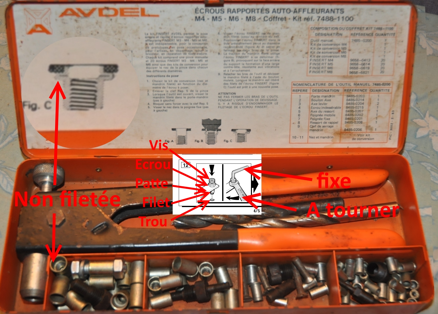 Vois les détails de la photo, le filetage tient par écrasement de sa partie non fileté sur la tôle. Pour se faire, il faut un trou pile poile du diamètre extérieur du filet (écrou) rapporté. Puis à défaut de la pince, c'est le même principe que les chevilles MOLLY, il faut tirer sur le filetage pour provoquer cette écrasement. Donc, il faut placer sur la longue vis dans l'ordre: l'écrou; la petite patte; le filet à rapporter. La vis doit dépasser de quelques filets le filet rapporté. Puis on place l'ensemble dans le trou à fileter en appuyant bien à fond sur la patte. On bloque la vis avec la clef Alen, on tourne l'écrou, ce qui a pour effet de tirer sur le filetage, au bout d'un moment cela écrase la partie non fileté. Toute la subtilité de l'opération consiste à savoir quand il faut s’arrêter de tourner la clef plate, car si trop, cela peut entrainer une rotation du filet par rapport à la tôle; et si pas assez ben... c'est pareil...