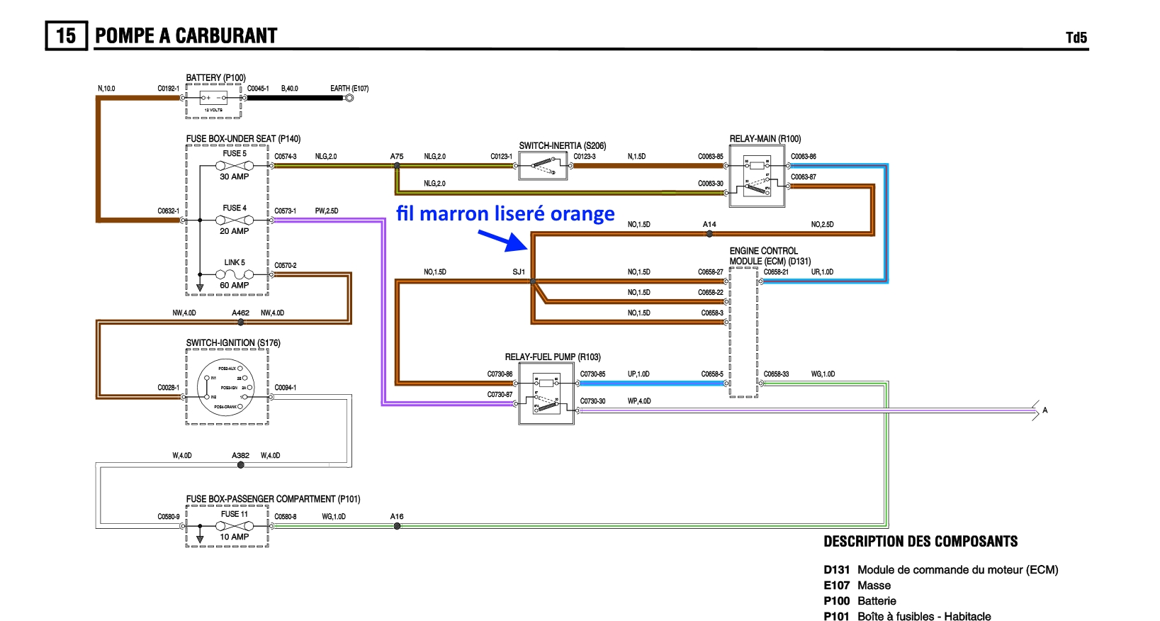 J'ai trouvé un fil marron liseré orange branché un autre fil marron via un fusible de 15A. Les 2 fils sortent de la même gaine. :shock: