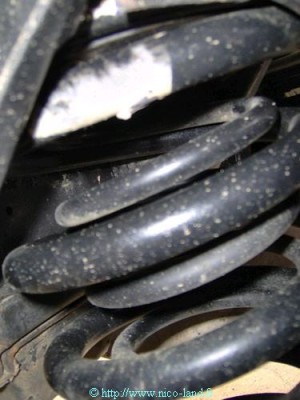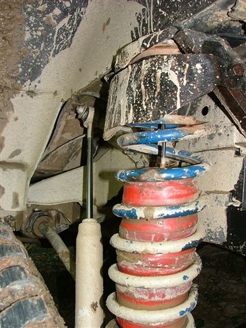 Il est vrai que ce montage particulier avec boudins et cônes extérieurs ne date pas d'hier, celui-ci ayant évolué vers d'autres horizons depuis, avec entre autres des x-spring de "x-eng" (petit ressort, à l'intérieur des gros, se décomprimant de 26cm au fur et à mesure au delà des gros, pas conçus en tant que tel pour des charges lourdes...bien que...) et des amortisseurs reconditionnables Bilstein dit "très grand débattement" tarés "sur Mesure" mis sur des Supports Haut décalés plus haut par rapport à ceux d'origine à l'av comme à l'ar.(pour éviter de rehausser tant que faire se peut, le Land...juste pour en améliorer les débattements de la suspension d'origine)