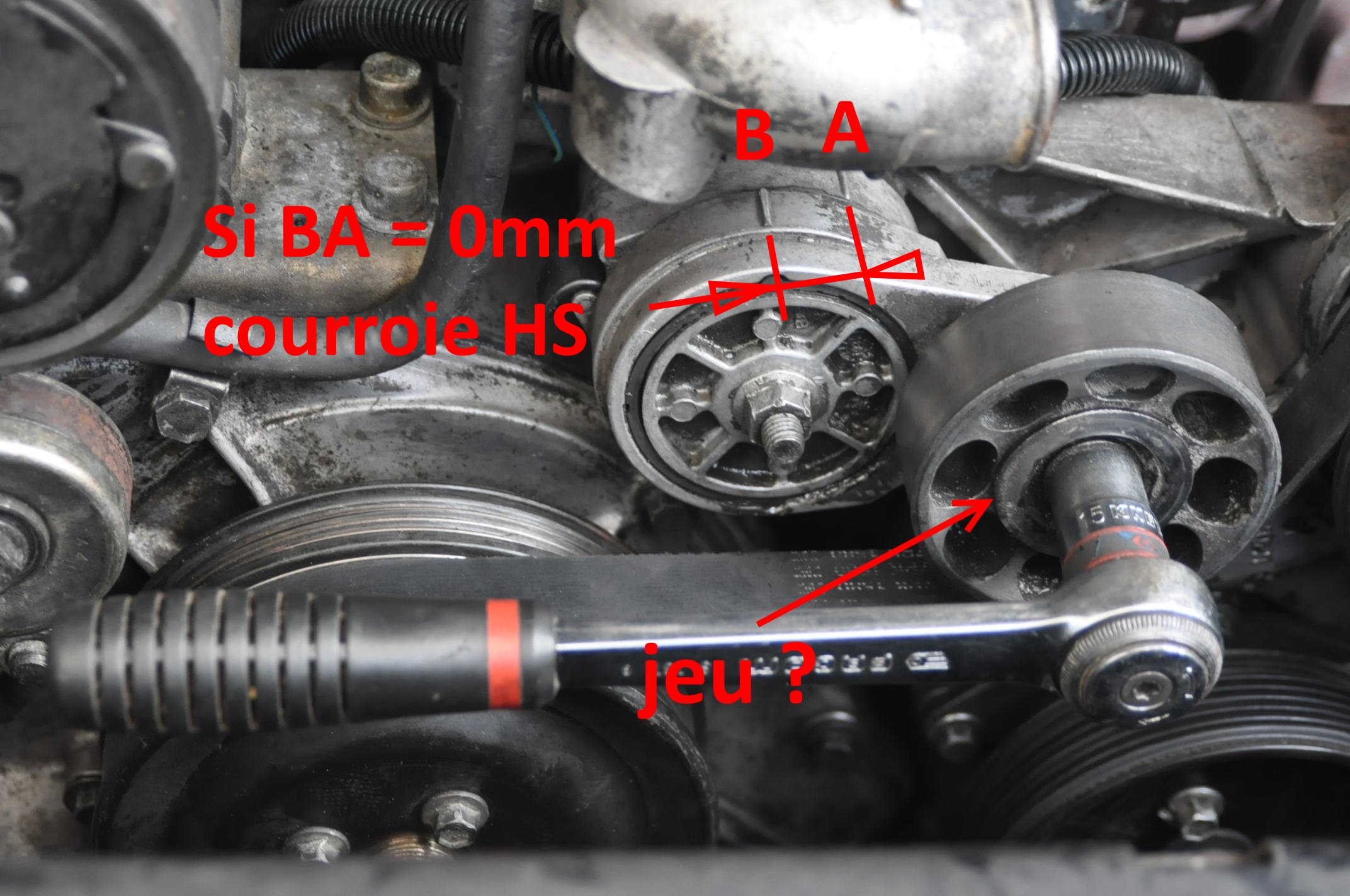 usure de la courroie d’accessoire, A = repère fixe, B se rapproche de A en fonction de l'usure de la courroie ( neuve sur la photo ) bouchon vase d’expansion bec de canard sur boitier de filtre à air
