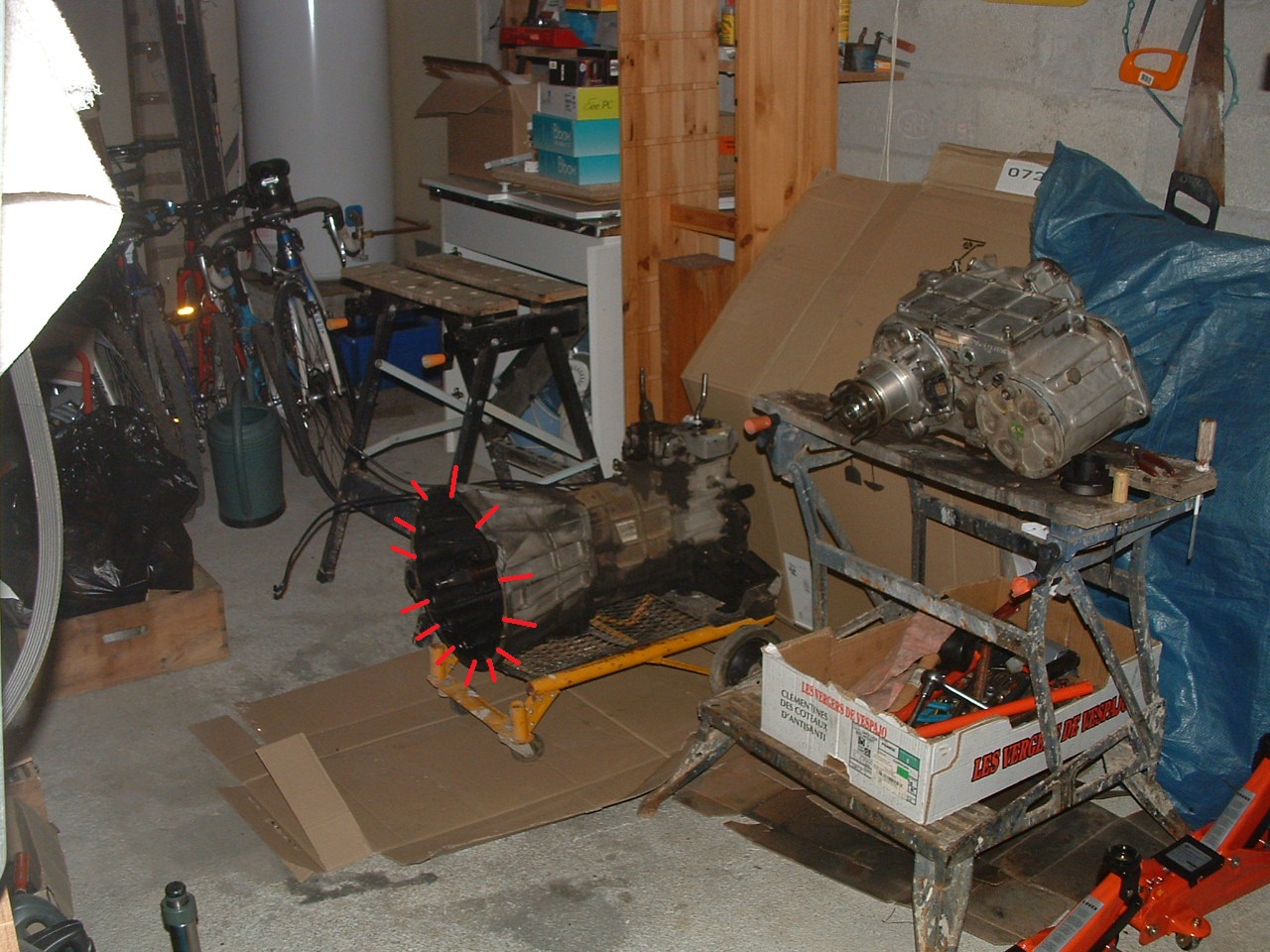 il faut déposer la traverse et basculer l'ensemble moteur / boites vers l'arrière (jusqu'à ce que la culasse bute contre le tablier) pour accéder aux vis du haut en s'aidant d'une rallonge et d'un cardan...