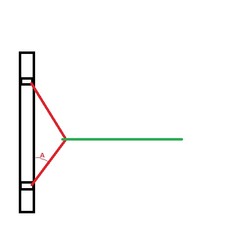 Maintenant je relie deux points d'ancrage avec une petite sangle (rouge), et la sangle principale de traction (verte) tire sur la petite sangle en son milieu. La tension dans la petite sangle va dépendre de l'angle A indiqué sur le dessin ci-dessous.