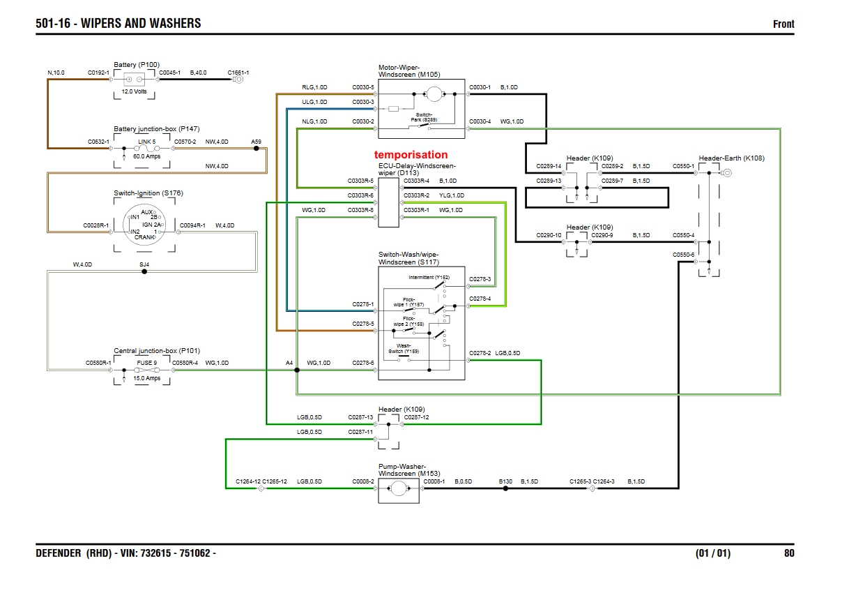 Certes une masse, qui paralyserait tout serait le connecteur C0550 sur le tablier derrière le vase d’expansion, au vue de tout ce quelle dessert, cela serait possible. Il faut vérifier le serrage de la vis et l'état d'oxydation des cosses du connecteur K108, C0550. Schéma partiel du circuit de masse relier a ce connecteur de masse C0550 page 01 sur 06 . On peut voir sur la page 04/06 que l'ouverture centralisé et le relais d'essuie glace sont sur cette même masse comme beaucoup d'élément, y compris l'alarme... Mais ce qui m'intrigue, je ne vois pas pourquoi en l'absence de masse, les essuies glace continuaient à fonctionner. Je peux imaginer que le relais de temporisation rouge, D113 soit en défaut aussi et maintienne l'alimentation sur le moteur d'essuie glace. Comme apparemment, la fonction intermittente ne fonctionne pas non plus, il y a peut-être là une piste. Le relais de temporisation des essuies glace est au dessus des fusibles. Mais quand même, toucher le commodo des phares, pour que tout fonctionne, bizarre comme phénomène.