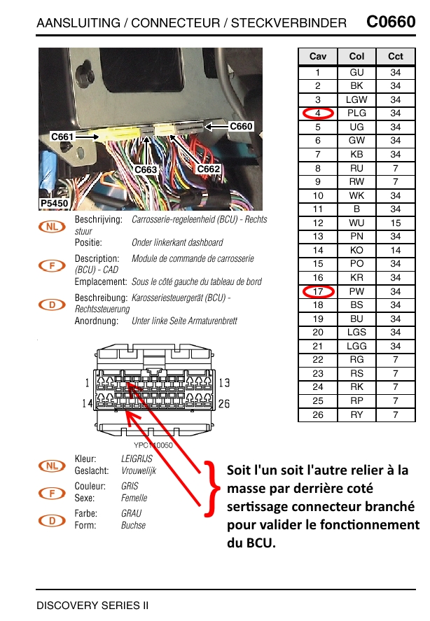 fil violet liseré vert clair broche 4, de ce même connecteur pour simuler les contacteurs des serrures passager et arrières. Car, si la liaison direct à la masse ne valide pas l'allumage des plafonniers, cela veut dire que le problème vient du BCU qui n’interprète pas l'ordre d’allumer les plafonniers en plaçant sa