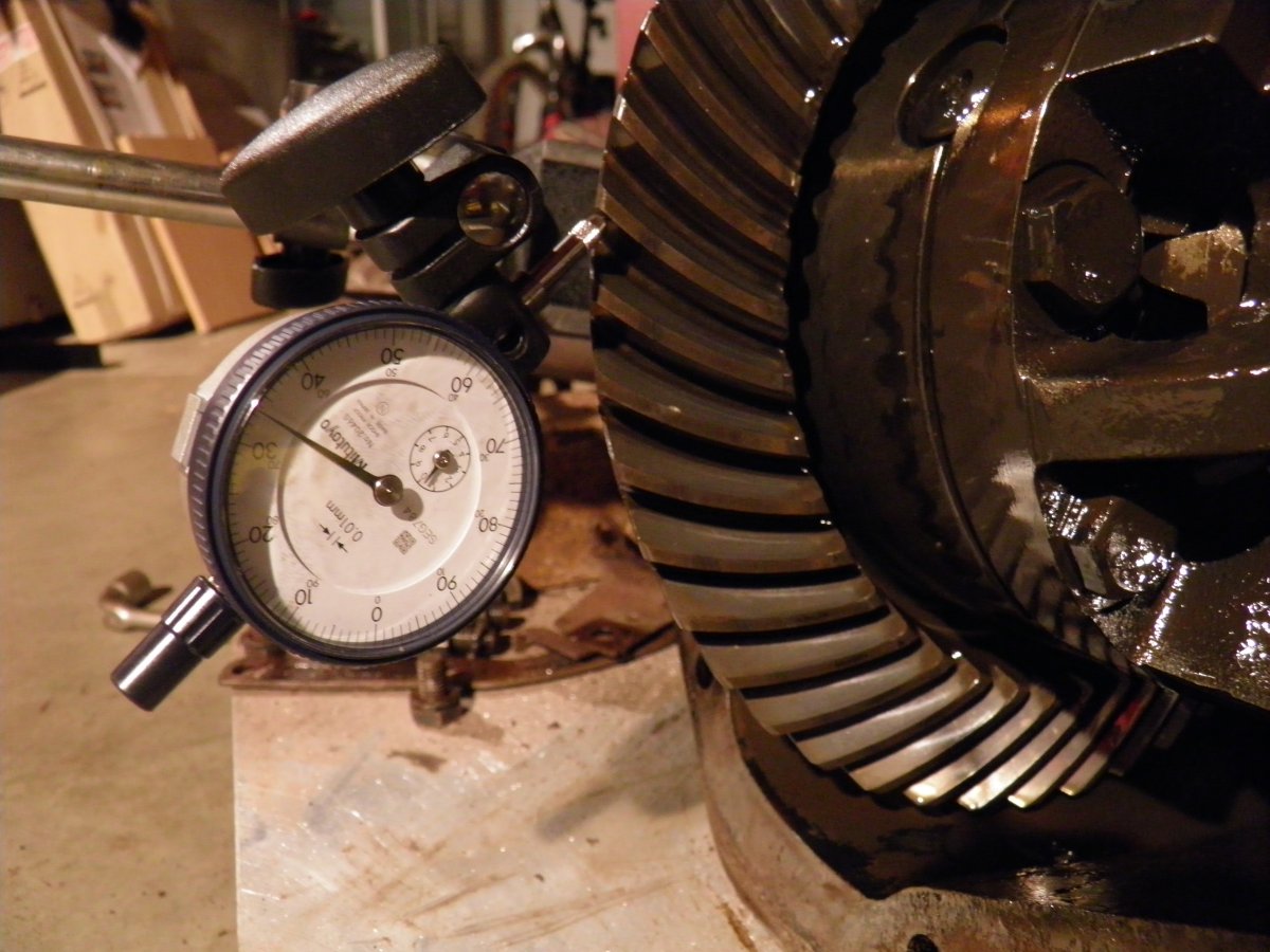 C'est à ce moment-là que je me suis rendu compte que deux parties du corps de pont gênaient : les deux petites protubérances sous les roulements de différentiel. Il faut donc sortir la disqueuse et "raboter" un peu tout ça : Ensuite, il faut surtout faire attention de ne pas basculer le bloc pour ne pas fausser la mesure. Cela ne se voit pas sur la photo, mais j'ai du remettre, sans les bloquer, les chapeaux de paliers tellement le différentiel "bascule" vite. Dans mon cas, le jeu mesuré est de 2,2 mm. Il faudra ajouter 0,127 mm (la précharge) pour obtenir l'épaisseur totale des rondelles d'épaisseur à mettre en place (valeur A).