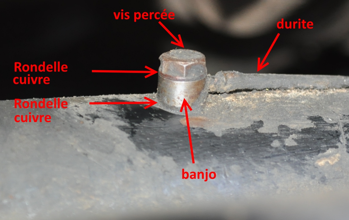 Le problème est qu'avec les vapeurs chaudes puis la condensation quand il refroidi, le trou du banjo se colmate (espèce d'agloméra de rouille, de poussière, de camboui), la mise à l'air ne fonctionne plus et la surpression sort au choix par un spi de moyeu et/ou le spi de tulipe et/ou le join de cloche et/ou le bouchon de vidange...