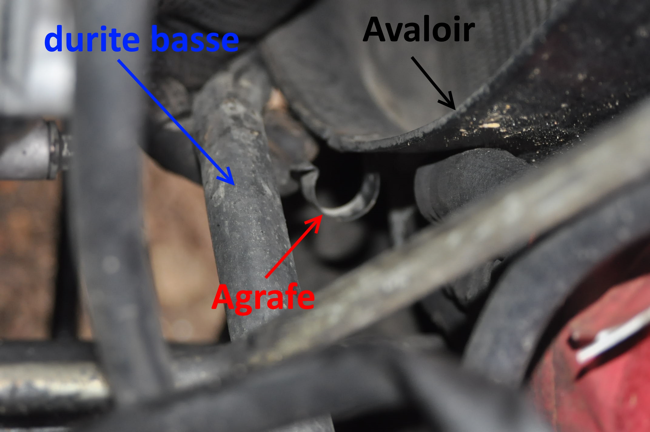 Afin de pouvoir sortir l'avaloir, sans tout tordre ni s’écorcher les doigts, il faut a ce stade démonter au minimum la durite d'eau du haut, coté radiateur et dégager de son agrafe de maintien à l'avaloir la durite du bas.