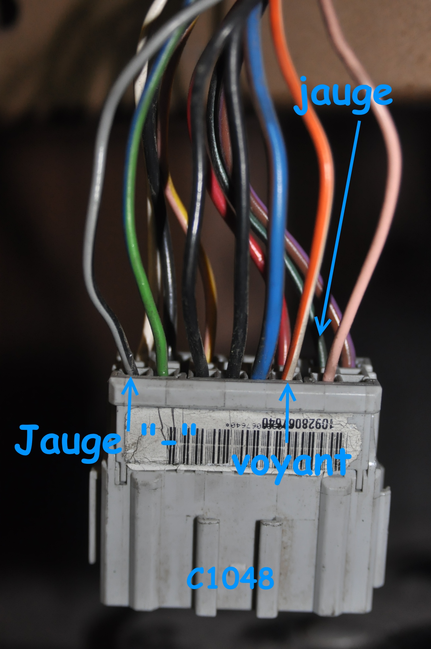 En toute logique le voyant doit s'éteindre, mais est-ce que le manomètre remonte ? Ensuite le gros connecteur gris C1048 du tableau de bord par lequel tout arrive, il dit quoi ? si tu le débranches, en appuyant bien sur l'ergot de verrouillage comme sur la photo, il dit quoi, propre, pas fondu pas oxydé pas humide... Une fois déconnecté, si tu mesures coté faisceau avec un Ohmmètre sur la jauge fil vert liseré noir et sur la jauge "-" fil gris liseré noir tu mesures quoi ?