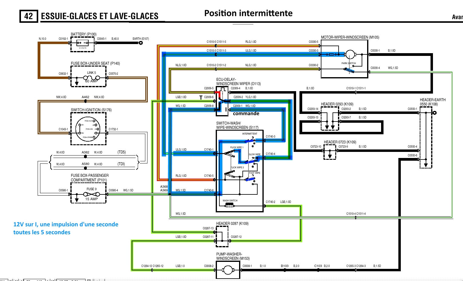 Test: les couleurs des liaisons, correspondent à la couleur de la position, ailleurs, il ne doit pas y avoir de liaison : Exemple en position lente, il doit y avoir le contact entre 8 et 3 et pas d'autre contact ailleurs Schéma pour la position intermittente: Schéma en position petite vitesse : Schéma en position rapide: Schéma en activant le lave glace, et la temporisation qui permet un cycle de 4 ou 5 balayages des essuies glace, sur un simple appuie fugitif sur le bouton, ou une prolongation de ces 4 ou 5 balayages en cas de maintien l’appuie. Je n'ai pas réussi pour l'instant de façon certaine à reporter la numérotation réelle du commodo sur le schéma des commodos de land rover.