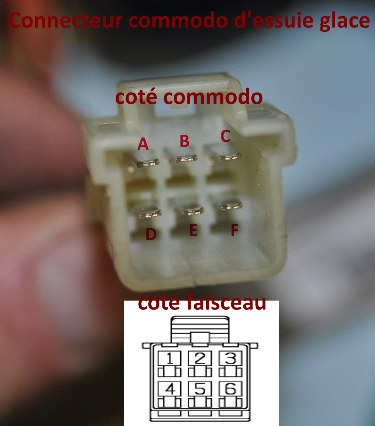 J'ai denomme les broches du connecteur cote comodo de A à F pour eviter de se melanger avec les numeros de broches du schéma coté faisceau (du fait du miroir quand on connecte les chiffres ne sont donc pas les memes )