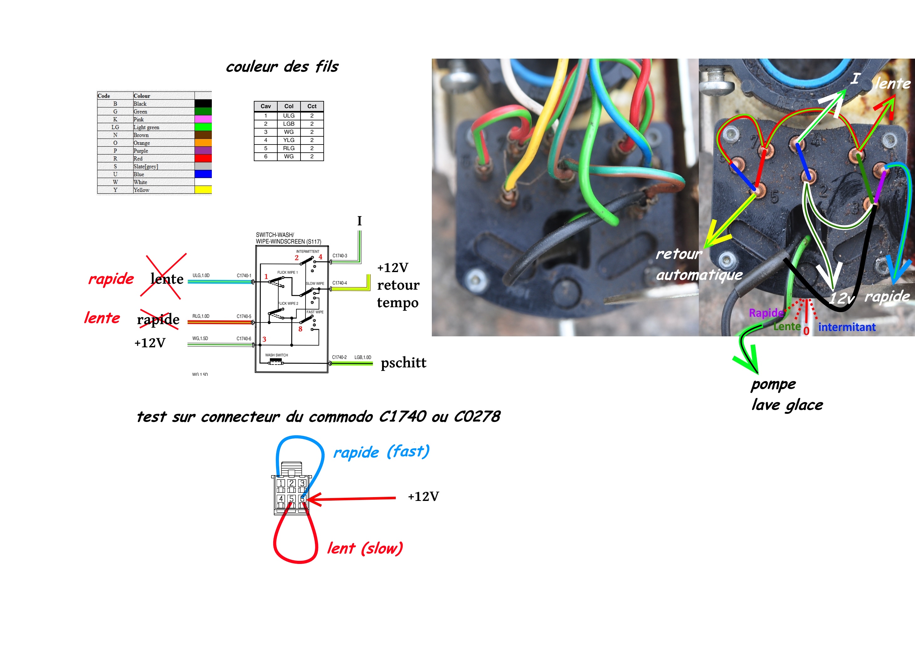 -Comment cela peut venir de l'interrupteur fin de course puisque avec un simple fil connecté entre les broches prise (coté faisceau) les essuies glace, lave glace fonctionnent bien? (mis a part inversion par rapport au schéma entre vitesse lente et rapide)