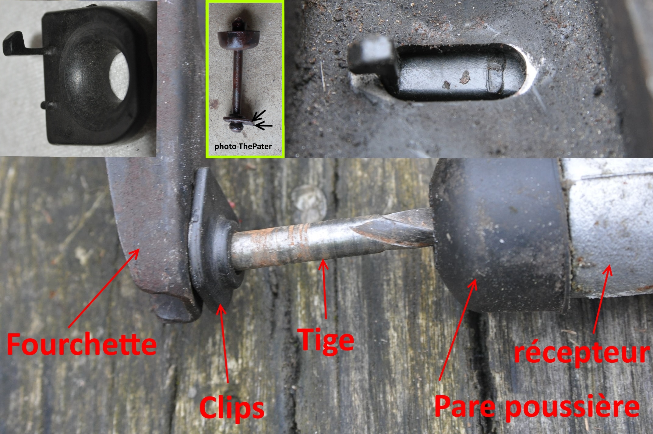 Pour extraire la fourchette de la rotule, il a fallu attaquer le bord du trou de la fourchette avec un marteau et un petit burin pour agrandir un peu le trou afin que la rotule puisse de nouveau passer dans l'autre sens afin d'extraire la fourchette de sont logement.