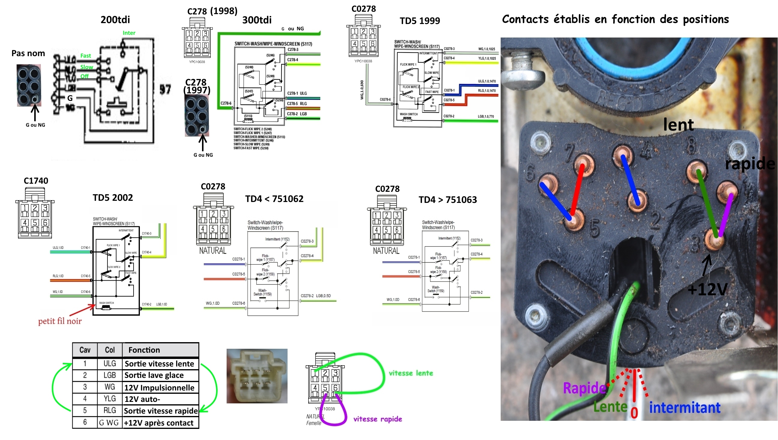 Tu peux faire un test en mesurant la résistance de contact entre (3 et 8 pour la vitesse lente) et (3 et 1 pour la vitesse rapide) directement sur les plots du commodo en ayant au préalable déconnecté les fils et le connecteur. Il faut te placer sur la position concernée pour effectuer la mesure de la qualité du contacte .Ce qui confirmerait le pronostique du commodo HS si sur la position lente tu as une résistance de contact anormalement élevée.
