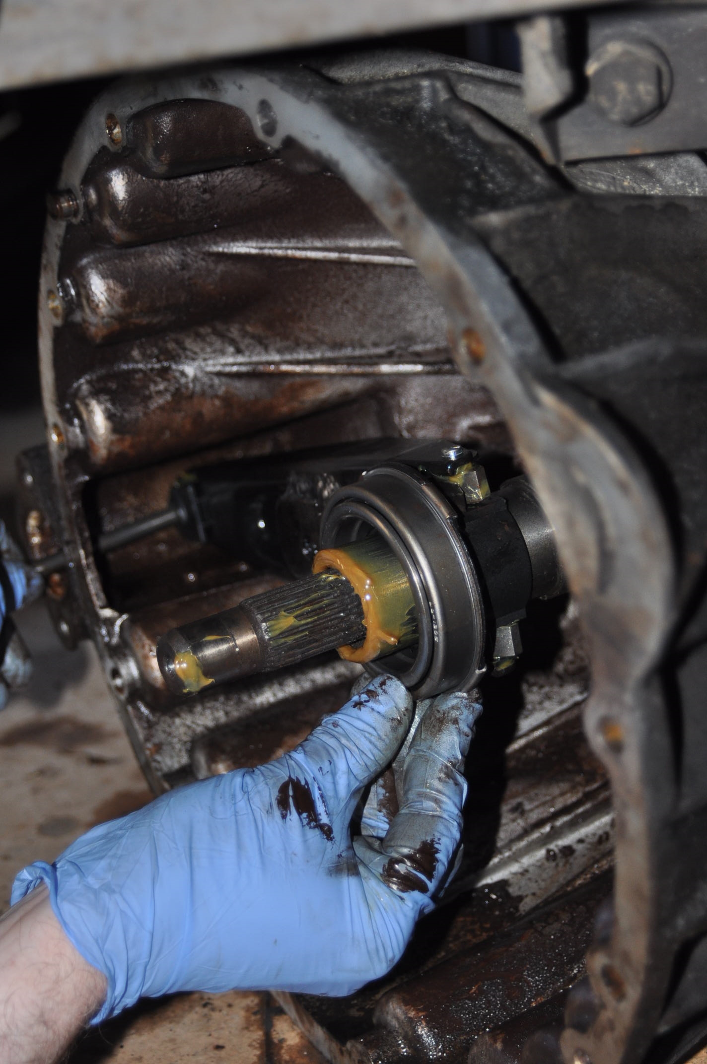 Présentation et positionnement d'une pièce maitresse du système, notez aux marques laissées dans la graisse, que la greffe s'est faite sans hésitation aucune, pile poile face aux logements des patins. Remarquez, la remarquable coordination du mouvement entre la main gauche et la main droite, permettant cette mise en place sans faille en centrant la fourchette d'une main gauche au centième près pour introduire les patins dans leur position, et là... le terme admiratif est bien faible ils n'ont toujours pas bougé d'un millimètre.