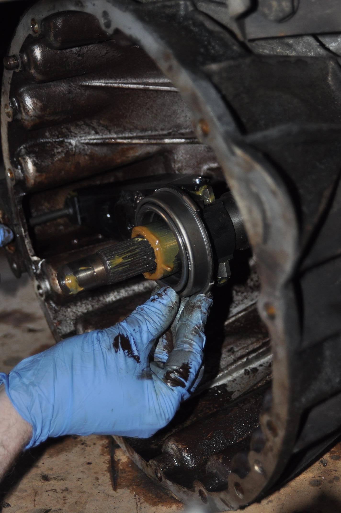 Présentation et positionnement d'une pièce maitresse du système, notez aux marques laissées dans la graisse, que la greffe s'est faite sans hésitation aucune, pile poile face aux logements des patins. Remarquez, la remarquable coordination du mouvement entre la main gauche et la main droite, permettant cette mise en place sans faille en centrant la fourchette d'une main gauche au centième près pour introduire les patins dans leur position, et là... le terme admiratif est bien faible ils n'ont toujours pas bougé d'un millimètre.