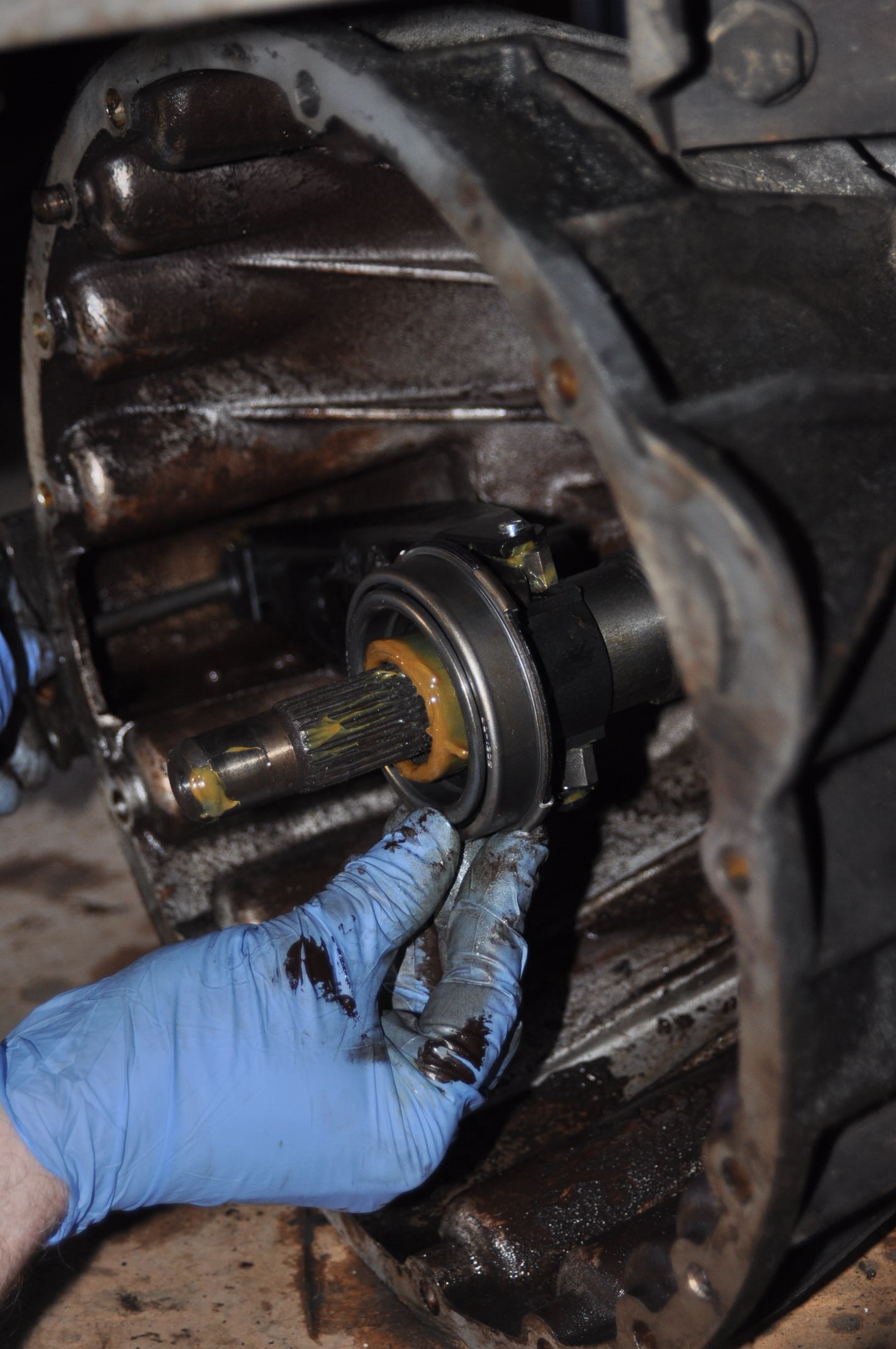 Présentation et positionnement d'une pièce maitresse du système, notez aux marques laissées dans la graisse, que la greffe s'est faite sans hésitation aucune, pile poile face aux logements des patins. Remarquez, la remarquable coordination du mouvement entre la main gauche et la main droite, permettant cette mise en place sans faille en centrant la fourchette d'une main gauche au centième près pour introduire les patins dans leur position, et là... le terme admiratif est bien faible ils n'ont toujours pas bougé d'un millimètre.