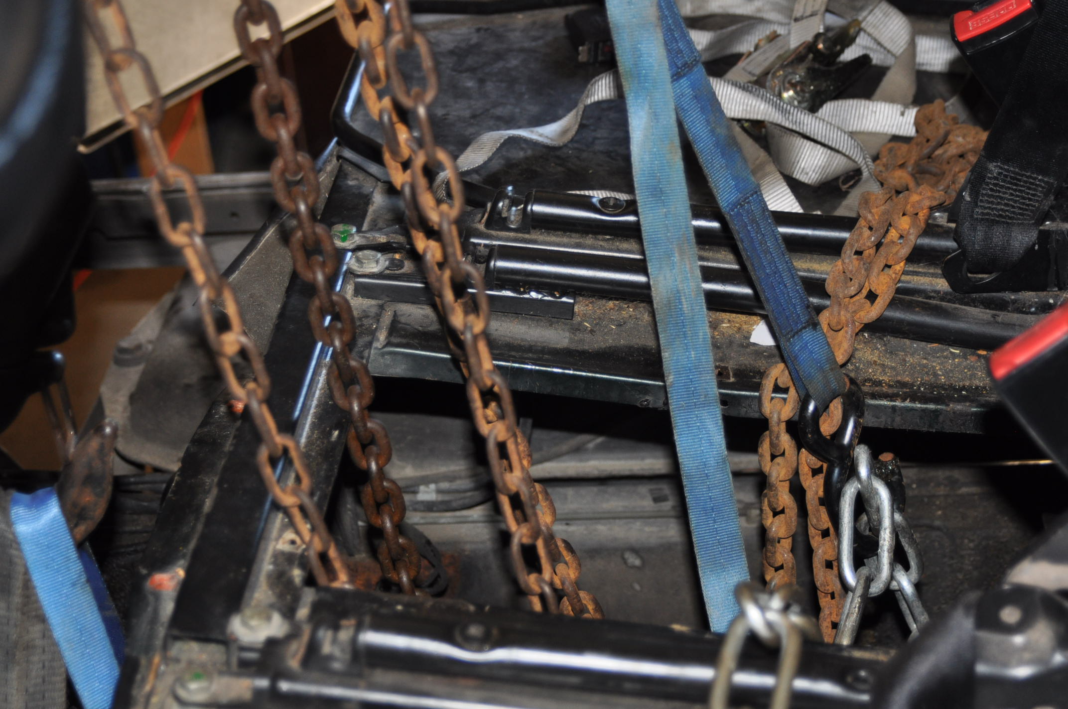 D'une part, nous étions un peu pris par le temps, entre le petit dej et l'heure de l'apéro, nous avions à peine 30mn pour remonter les boites. Avec chacun nos doutes sur le temps nécessaire à la mise en place de l'outil, le démontage des sangles, de la chaine d’équilibrage arrière. Mon plus gros doute était la place pour monter la potence réalisé plus longue que la tienne, la position de la barre de fixation du palan, et son aplombs par rapport a l'outil, je craignais à tort surement une difficulté de passage dans l'ouverture centrale du caisson des sièges, puis de l'approche vers le moteur.
