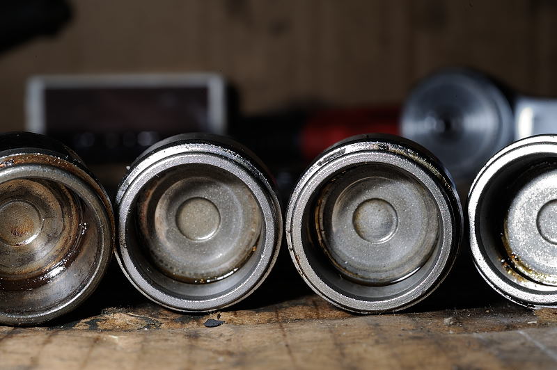 J'ai découvert que les fonds des cuvettes du croisillon ayant laché à 17500 km sont marqués. Le tourillon a frotté contre la cuvette. Le montage est trop serré, bien que je frappe les chapes pour faire remonter la cuvette contre le circlips. La cuvette la plus marquée correspond a celle du tourillon trés détérioré (je l'ai reconnu grace à la couleur et l'aspect caramélisé de la graisse, a gauche sur la photo). J'imagine, qu'en plus de la limaille produite, l'absence de jeu empêche le passage de graisse, le tout aboutisasnt à la destruction si rapide de l'ensemble.