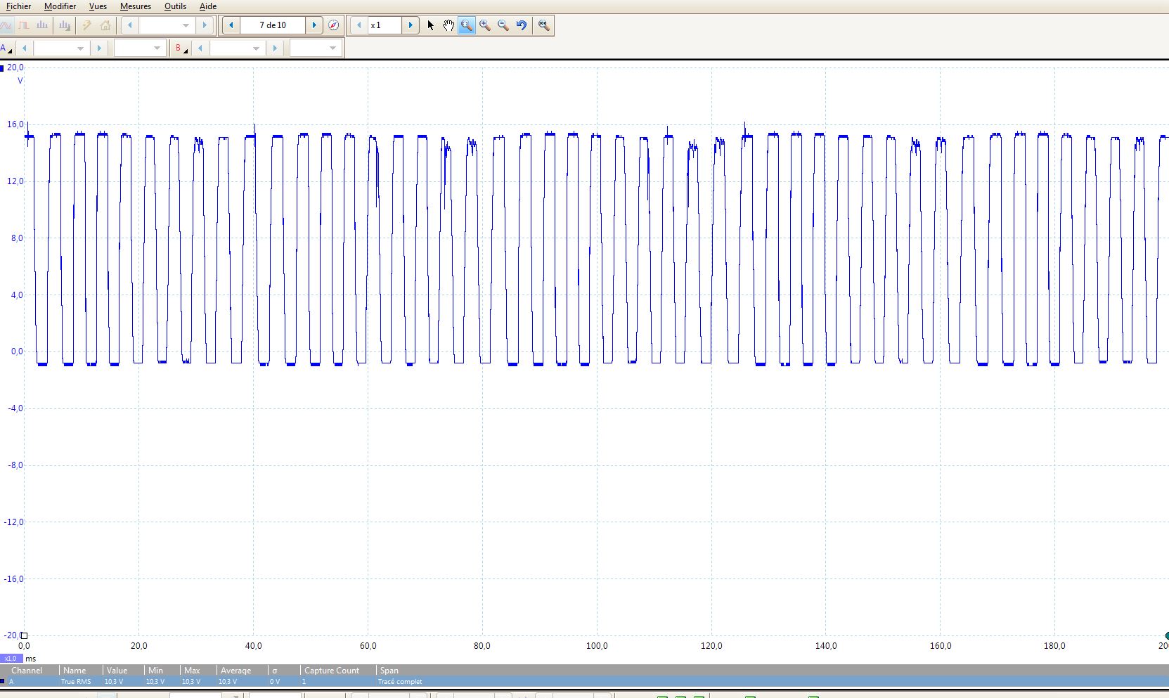 De nouveau pour l'anecdote, le calcul de la tension efficace (et je ne parle pas de la fréquence, impossible à calculer pour un ECU classique) montrait qu'on passait de 10,3 V (le paramètre s'appelle TRUE RMS et on le trouve en bas à gauche de l'écran) à 1,748 V, soit une perte de signal de plus de 80%. Impossible pour l'ECU de se sortir d'un tel merdier, évidemment.