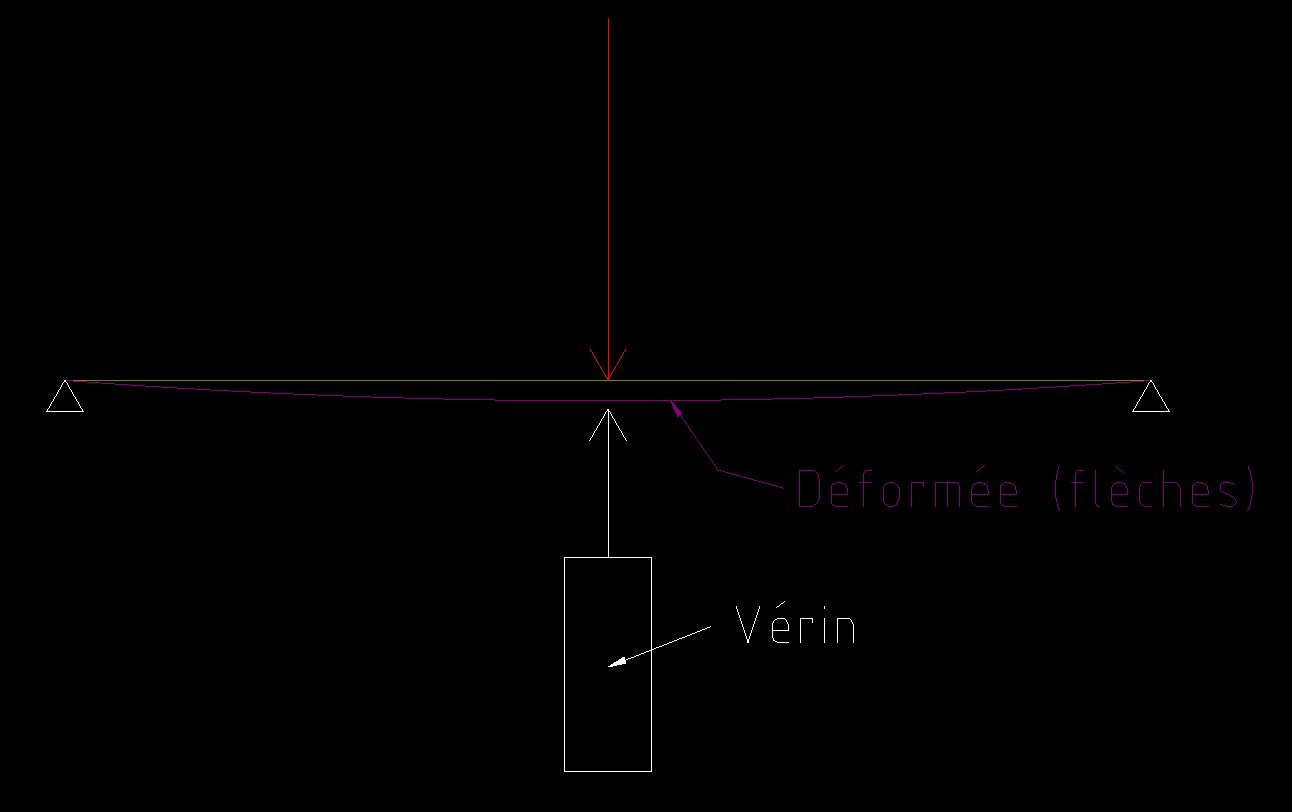 Plus on va vériner, plus la valeur de la flèche va diminuer. Et à un moment, notre vérin va finir par encaisser la totalité de la force qui était supportée par la poutre. Celle-ci ne portera plus sur ses appuis et les contraintes de flexion qui la sollicitaient auront totalement disparu :