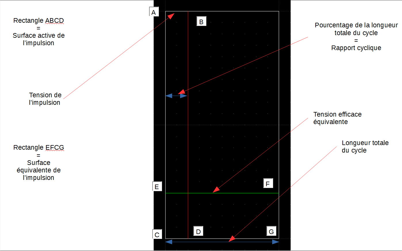 Attention : ces rectangles sont en réalité tous jointifs. Le logiciel que j’ai utilisé les centre sur les intervalles pour agrémenter la présentation mais « électriquement », chaque tension règne bien sur l’ensemble de l’impulsion (segment CD sur le graphe précédent).