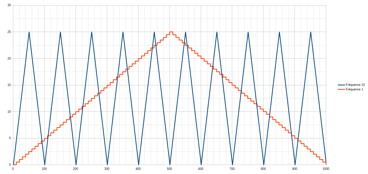 Dans les deux cas, la loi de variation du rapport cyclique est inchangée et c’est ça l’astuce qui m’a échappé au début : ici, j’ai opté, de manière tout à fait arbitraire, pour un rapport cyclique de l’impulsion n égal à celui de n-1 + 10 %.