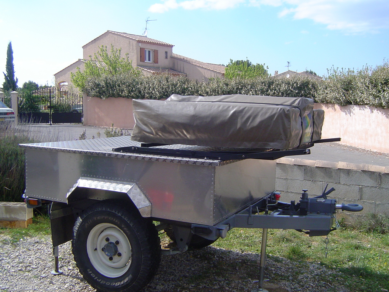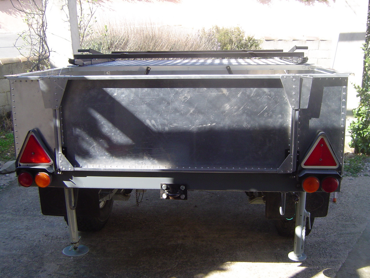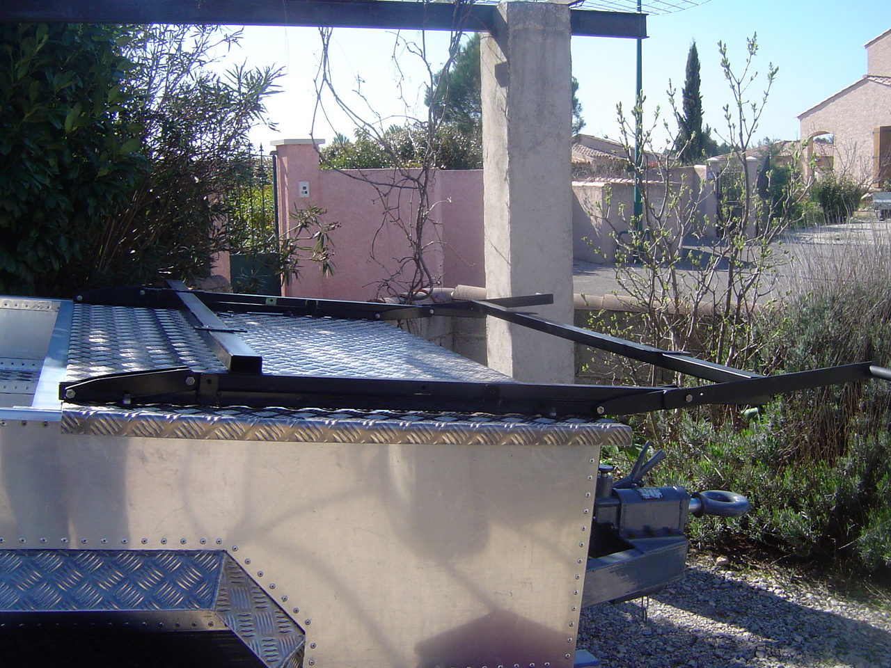La ceinture de caisse est terminée, ainsi que la ridelle.J'ai abandonné l'idée de faire 2 capots articulés (1 avant et 1 arrière).Pour cause, le poids de la tente sur le capot avant.Donc celui-ci sera fixe et j'aménagerai ultérieurement deux grandes trappes sur la face avant.Comme je ne veux pas que la tente dépasse au dessus du timon, évidement elle dépasse sur le capot arrière.Donc il a fallu que j'aménage un sytème pour la décaller sur le timon pour avoir accès à l'arrière.