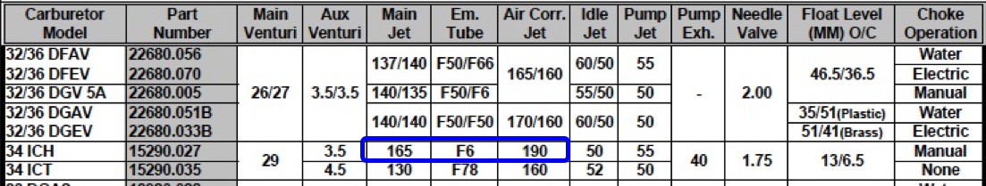 However a 165 Main Jet , 190 Air Correction Jet and F6 Emulsion Tube will normally get a stock 2-1/4L engine running acceptably well at or near sea level.