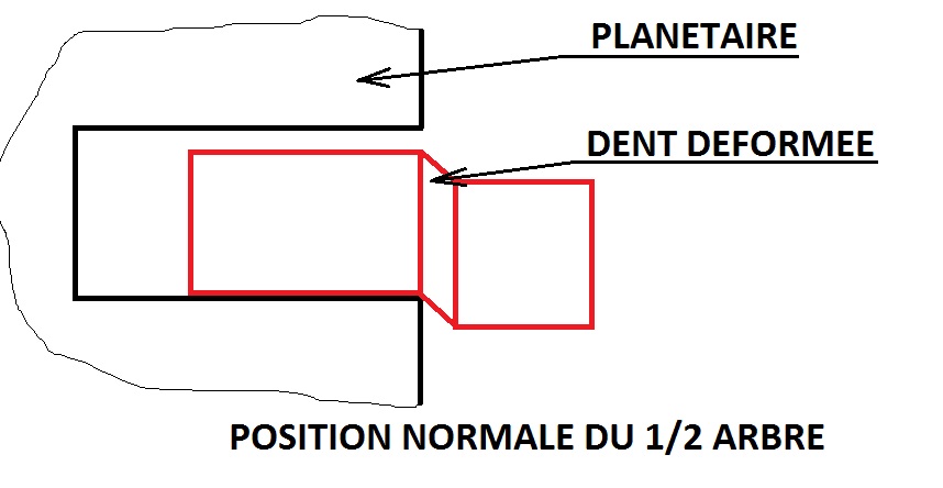 Si ton arbre est trop rentré, les cannelures vont travailler davantage, car les surfaces des portées ont diminué. Si en plus, les cannelures de l'arbre ont légèrement vrillé (les deux effets se cumulent dans le mauvais sens) on peut penser qu'un épaulement de quelques centièmes s'est formé sur la partie de l'arbre qui dépasse du satellite côté centre du différentiel.