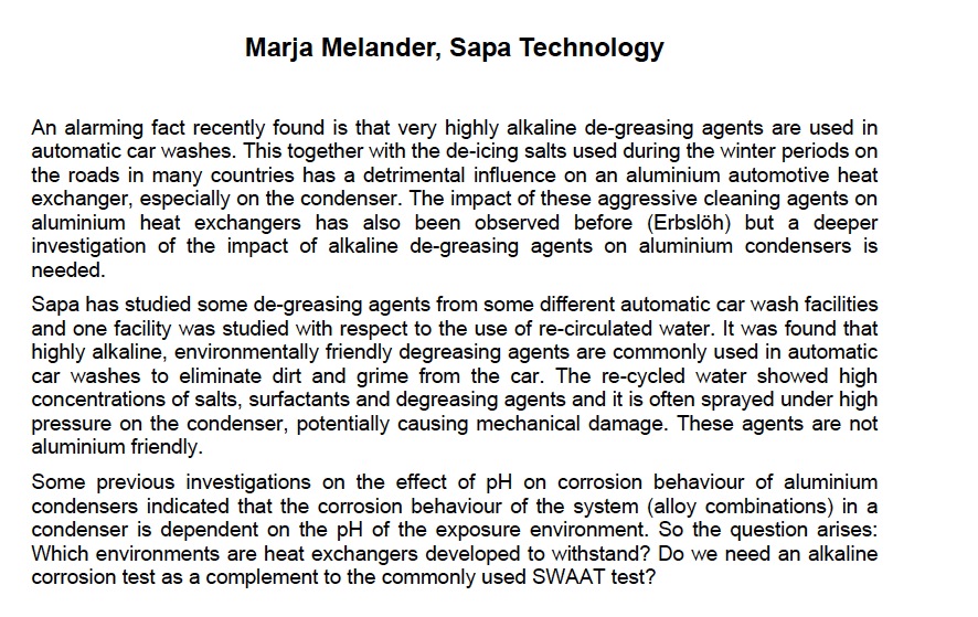 3/ En parallèle, l'exposition du radiateur à des agressions externes s'est accrue. Selon SAPA Heat Transfer (du groupe suédois SAPA), spécialisé dans la production d'aluminium à braser pour échangeurs thermiques, il ne fait aucun doute que les cycles de salage routier en périodes hivernales créent des conditions de corrosion accélérée pour les radiateurs des véhicules automobiles.