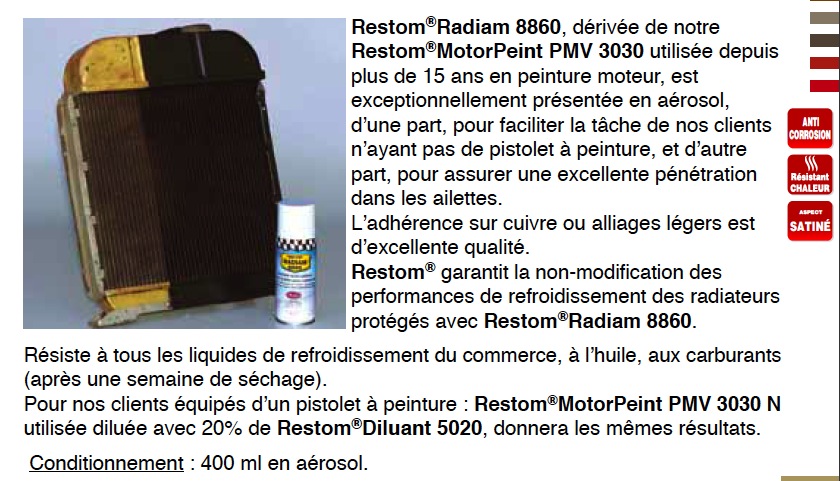 6/ On peut comprendre que certains préconisent dès lors une peinture protectrice du radiateur. J'ai regardé ce que conseille Restom, utiliser une peinture moteur que l'on va diluer (pour ne pas épaissir les ailettes de refroidissement). Restom propose en bombe cette peinture, à la bonne dilution :