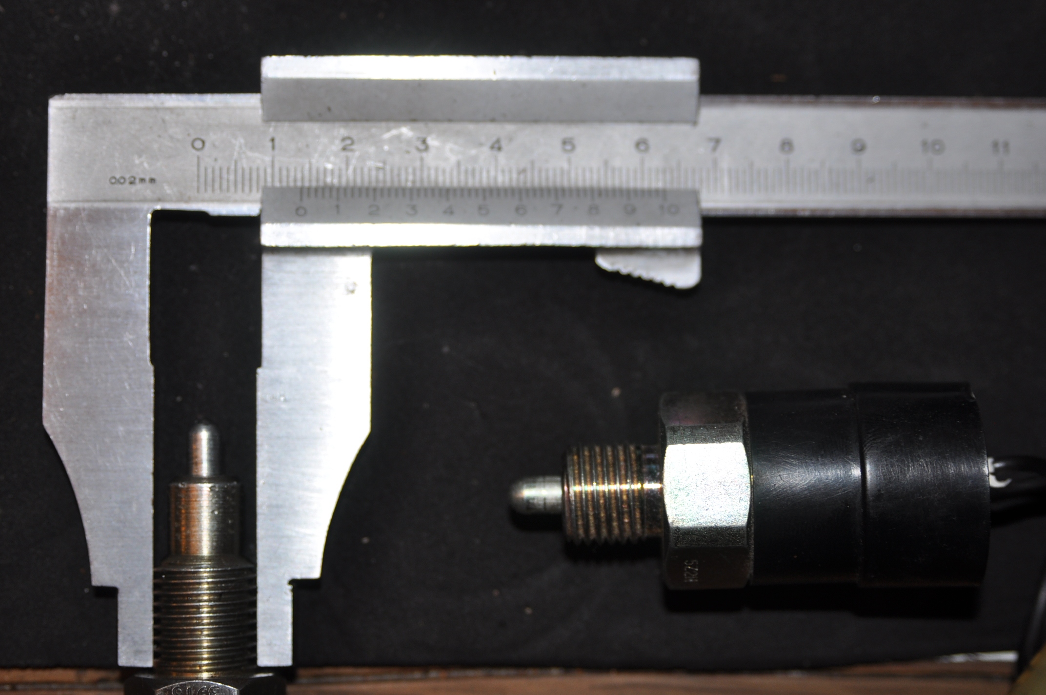 La longueur totale: De la portée du joint jusqu'au bout du téton est de 35mm; le téton sort de 8mm. Le filetage, c'est du M14, longueur filetée 16 mm, tu peux peut-être trouver une grosse vis pour boucher le trou en attendant de trouver un contacteur. Personnellement, je garde tout et je dirais même plus, surtout ce qui est cassé, c'est pratique, soit pour récupérer un bout, soit pour faire des photos. En général, cela fait plaisir aux copains .