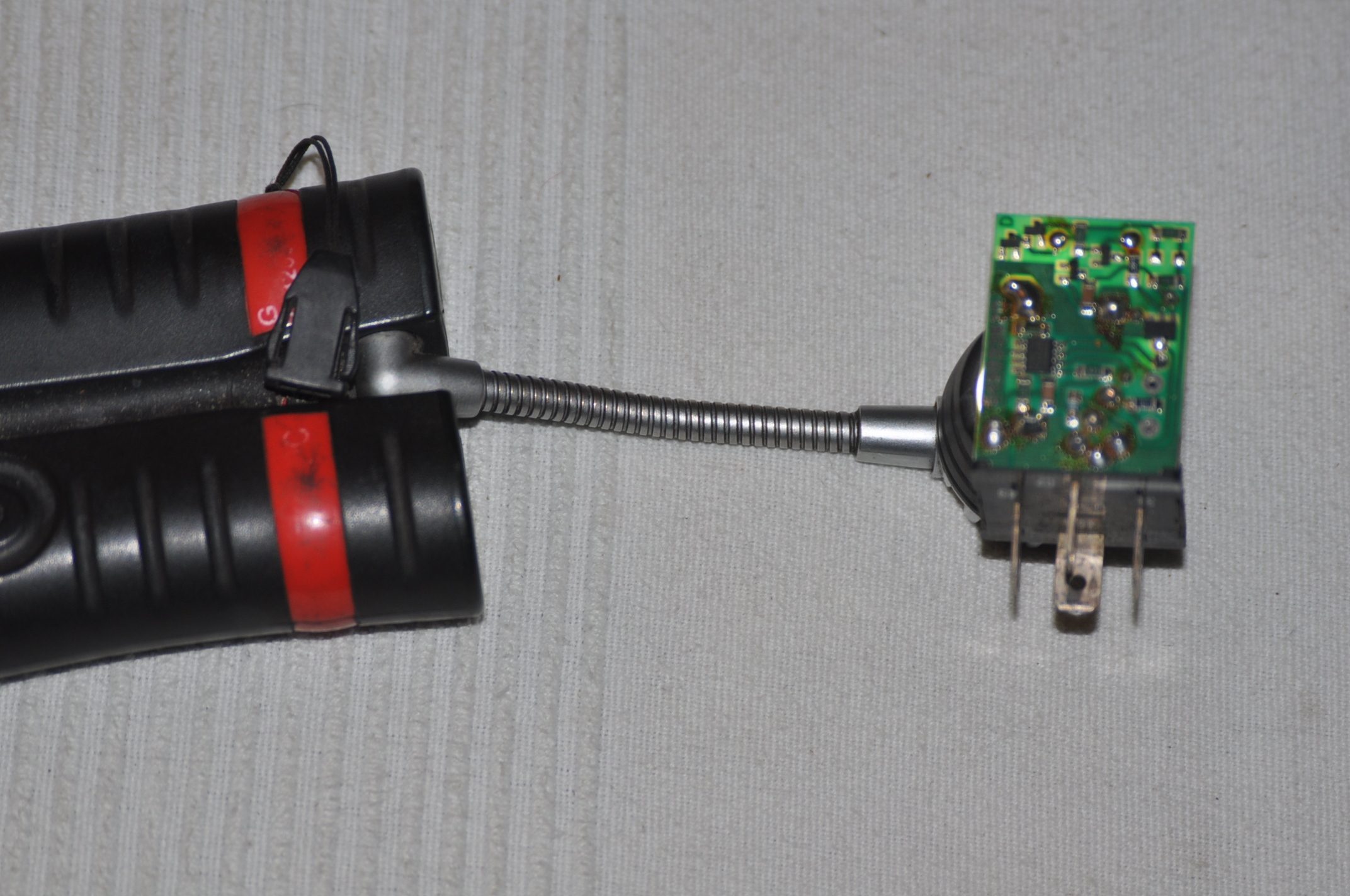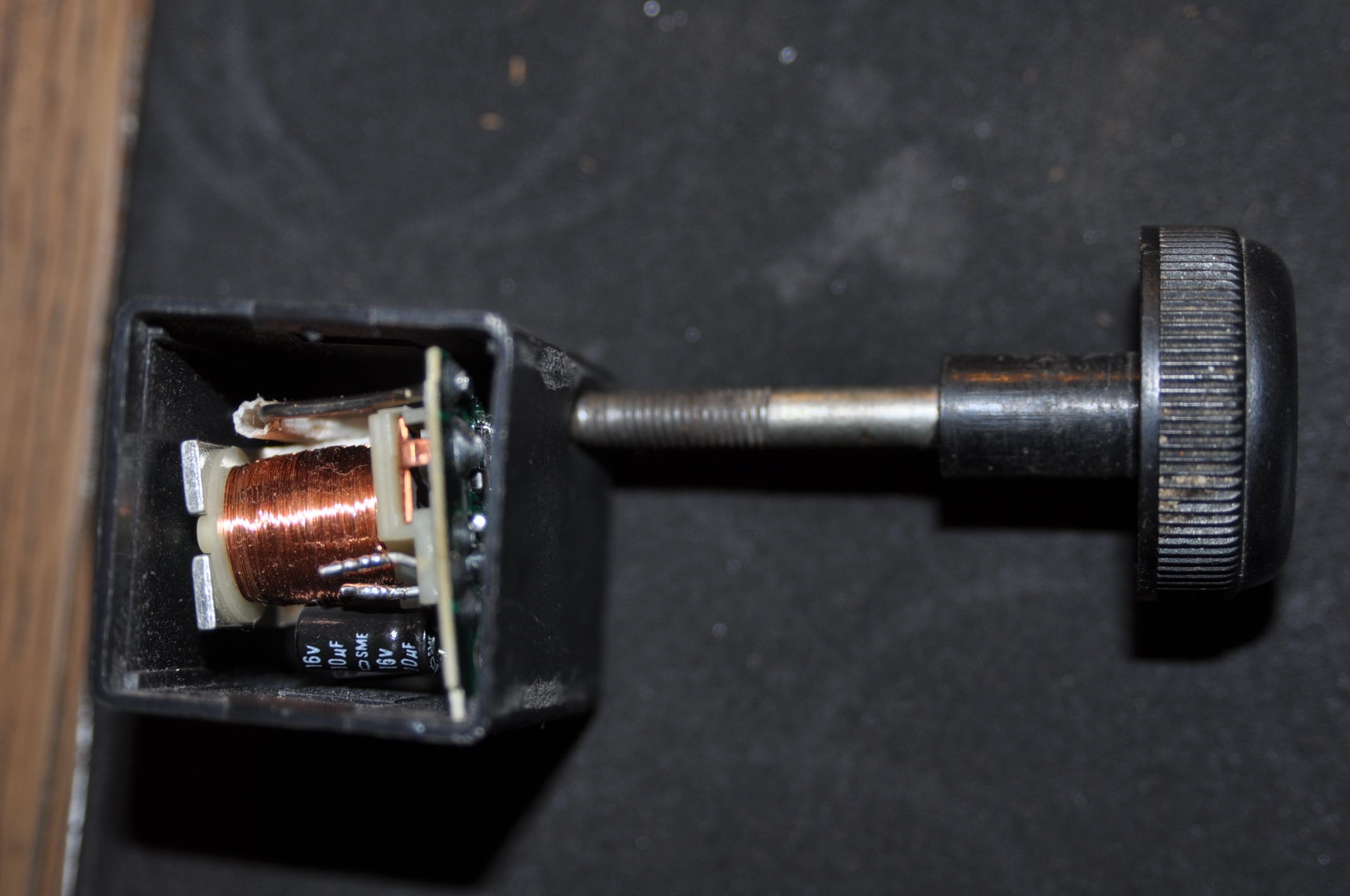 10) Sur la table d’auscultation, on voit le bossage fondu. La partie cuivré permet d'établir le contact entre les clignotants gauche, droit, le voyant du bouton et la sortie de la centrale à 1,55Hz.