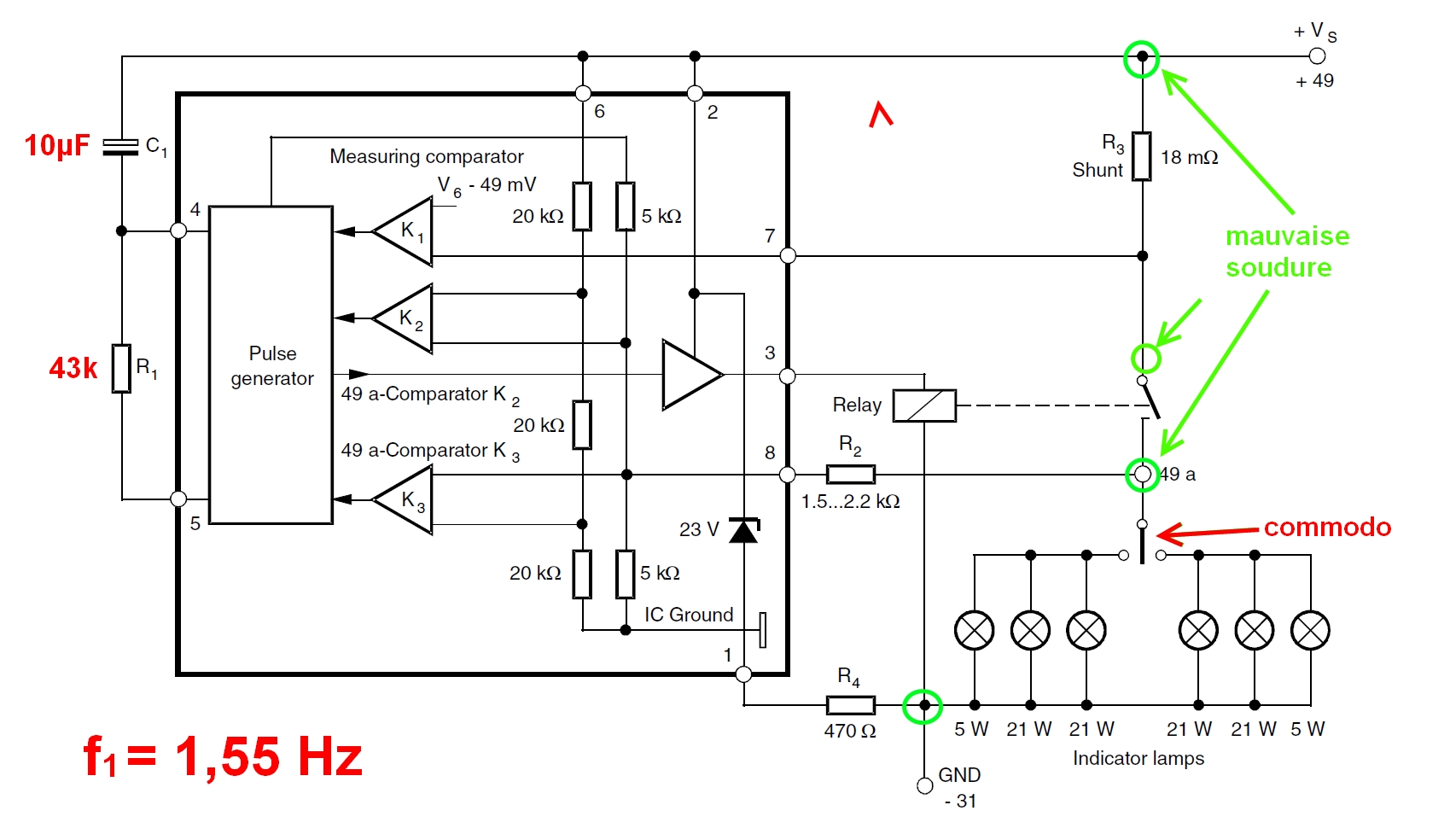6) Au passage sur la doc constructeur du circuit intégré principal U6043B (Flasher IC with18-mΩ Shunt), sont repérés les emplacements des mauvaises soudures. Le calcul de la fréquence de clignotement exact est de 1,55Hz.