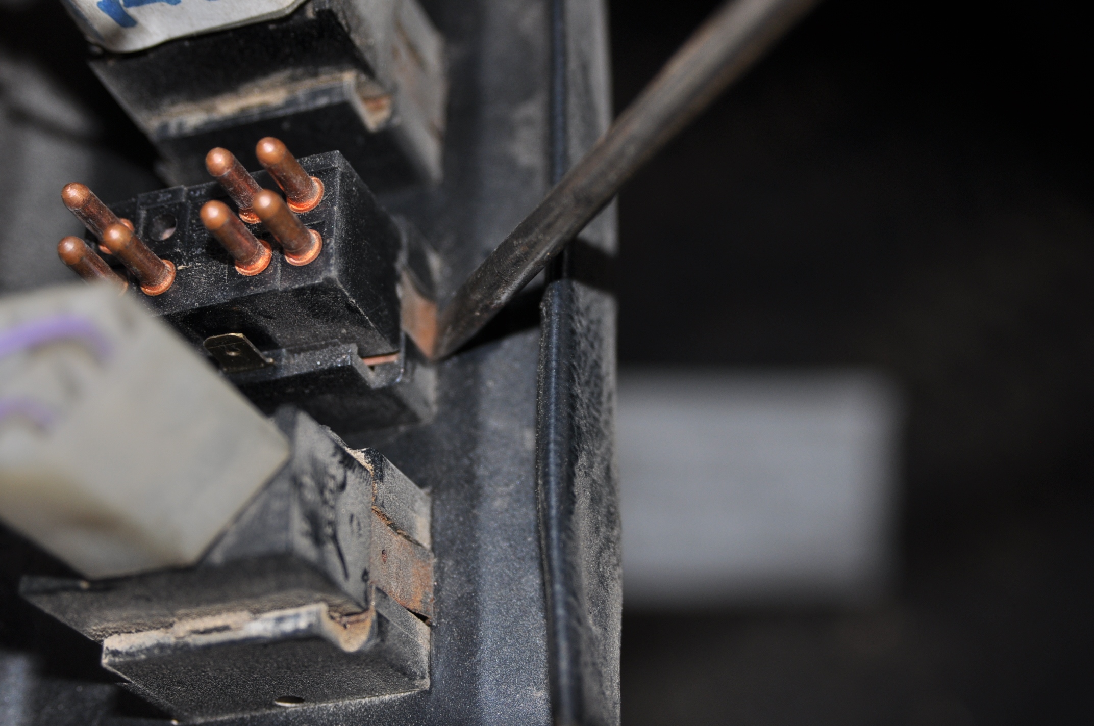 ► Si un fil arrive à établir la liaison, peut-être que l'une des deux cosses femelle du support a perdu de son effet ressort car trop écartée, mais que l'on arrive quand même à établir le contact avec un fil placé à l’intérieur. Dans ce cas avec une petite pointe ou un petit tournevis resserrer légèrement les cosses.