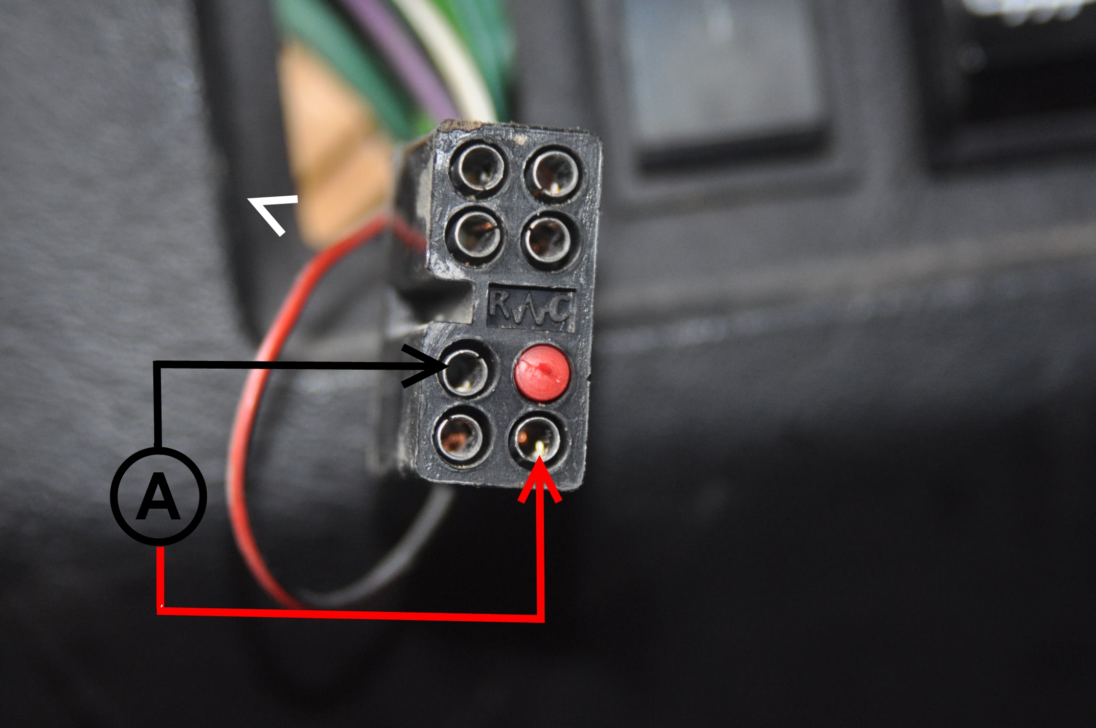 ► Débranches le connecteur de tablier dans le compartiment moteur sur lequel tu trouves les deux fils des clignotants qui vont vers l'arrière. Fil vert liseré blanc et fil vert liseré rouge. ► Contrôles de nouveau le courant dans les deux positions, cette fois si tout va bien, tu dois lire environ 2,3 A, car il n'y a plus l'ampoule arrière.