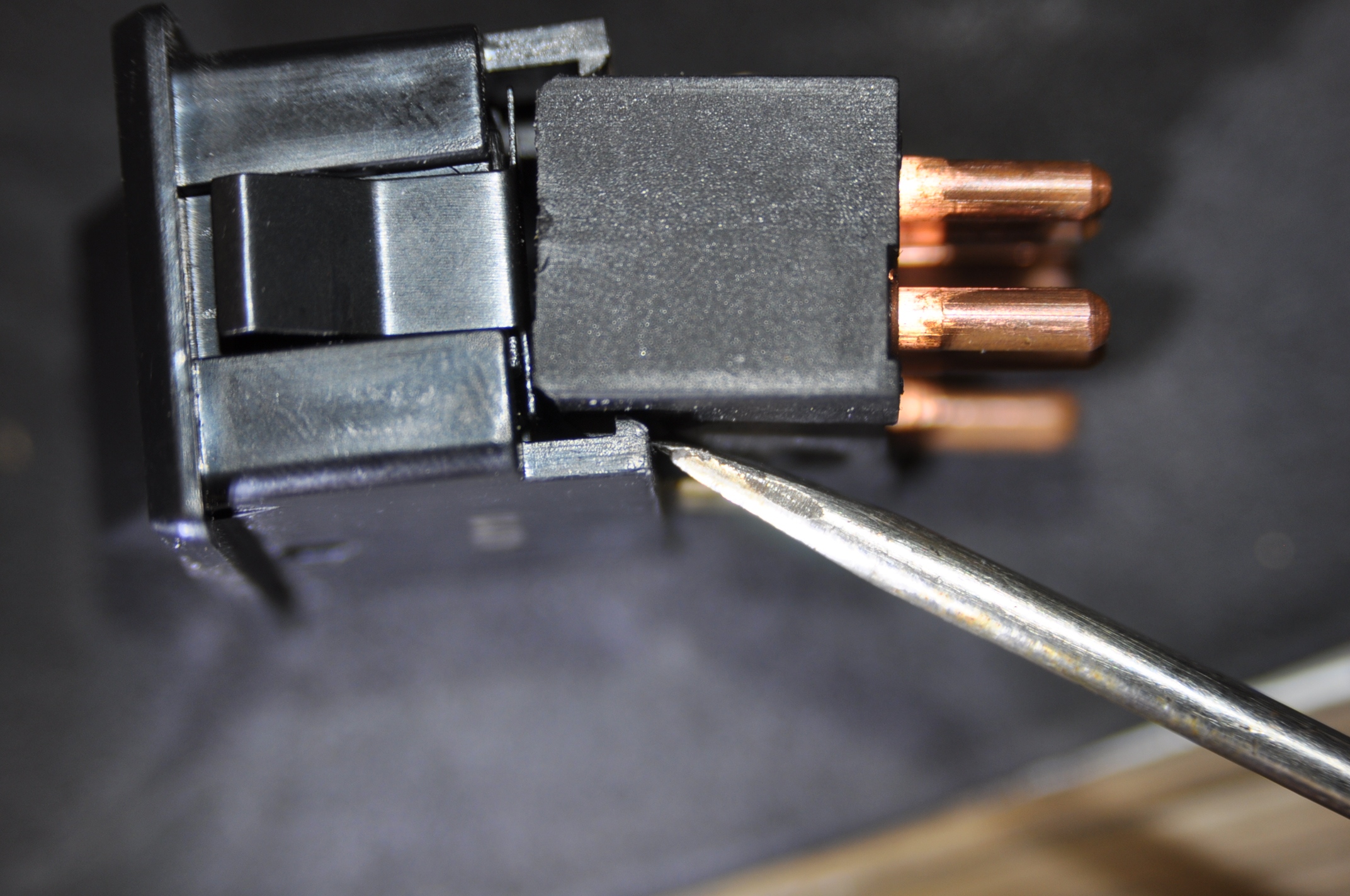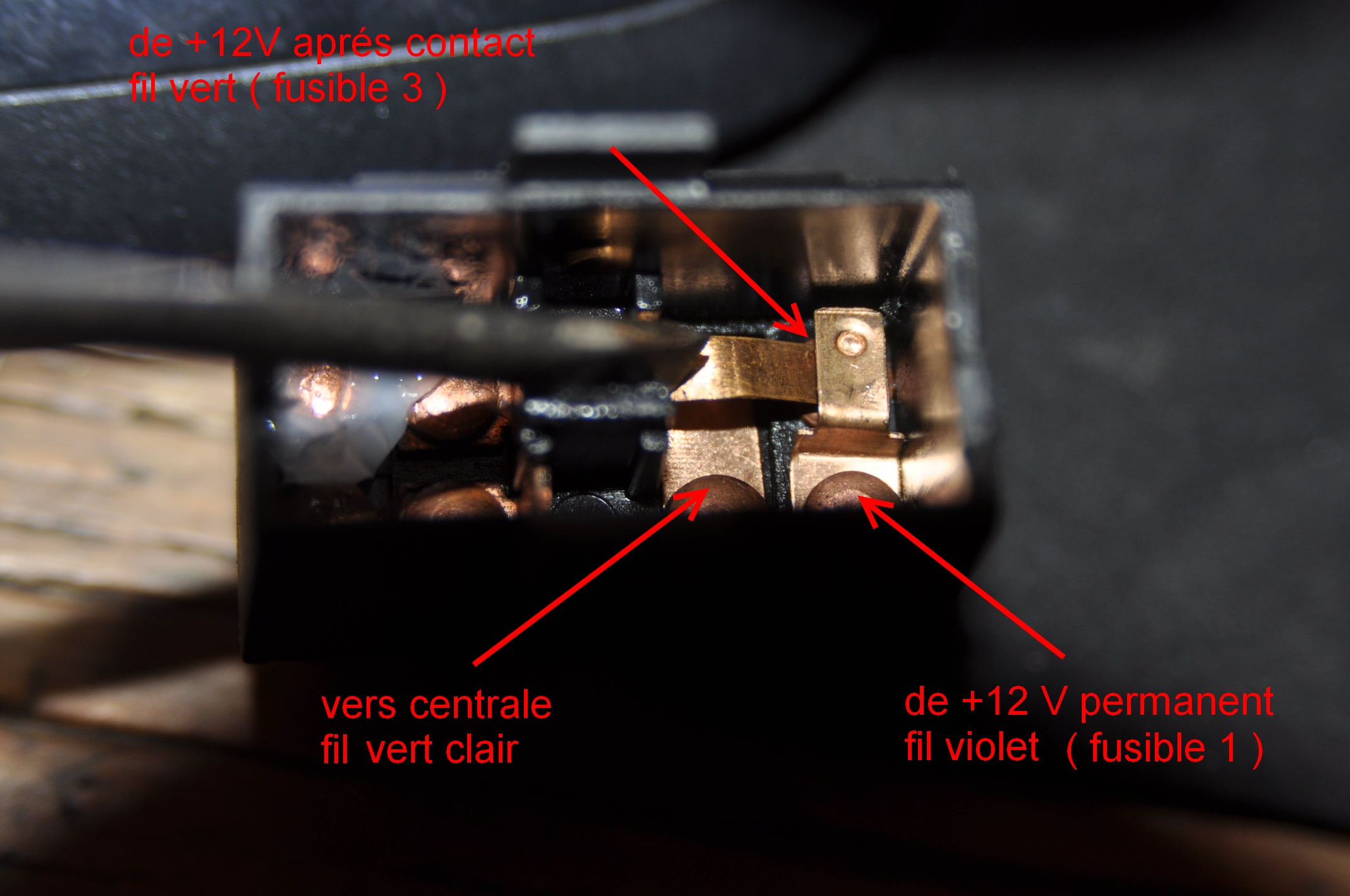Violet = 12 V permanent Une vue d'ensemble du bouton et du connecteur au regard l'un de l'autre. On voit qu'il y a un détrompage réalisé à l'aide d'un pion en plastique rouge: Pour le démontage du bouton, il est préférable de démonter les trois vis du cache et de s'aider d'un tournevis pour appuyer sur les languettes de verrouillage en cuivre, sous peine de tout arracher d'une part et il sera ainsi beaucoup plus simple et plus sûr de rebrancher les cosses du voyant du bouton qui ont beaucoup de mal à passer dans le trou du bouton en même temps que le bouton. Heu