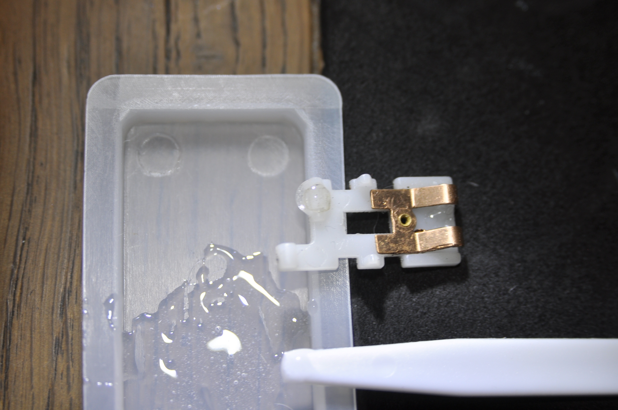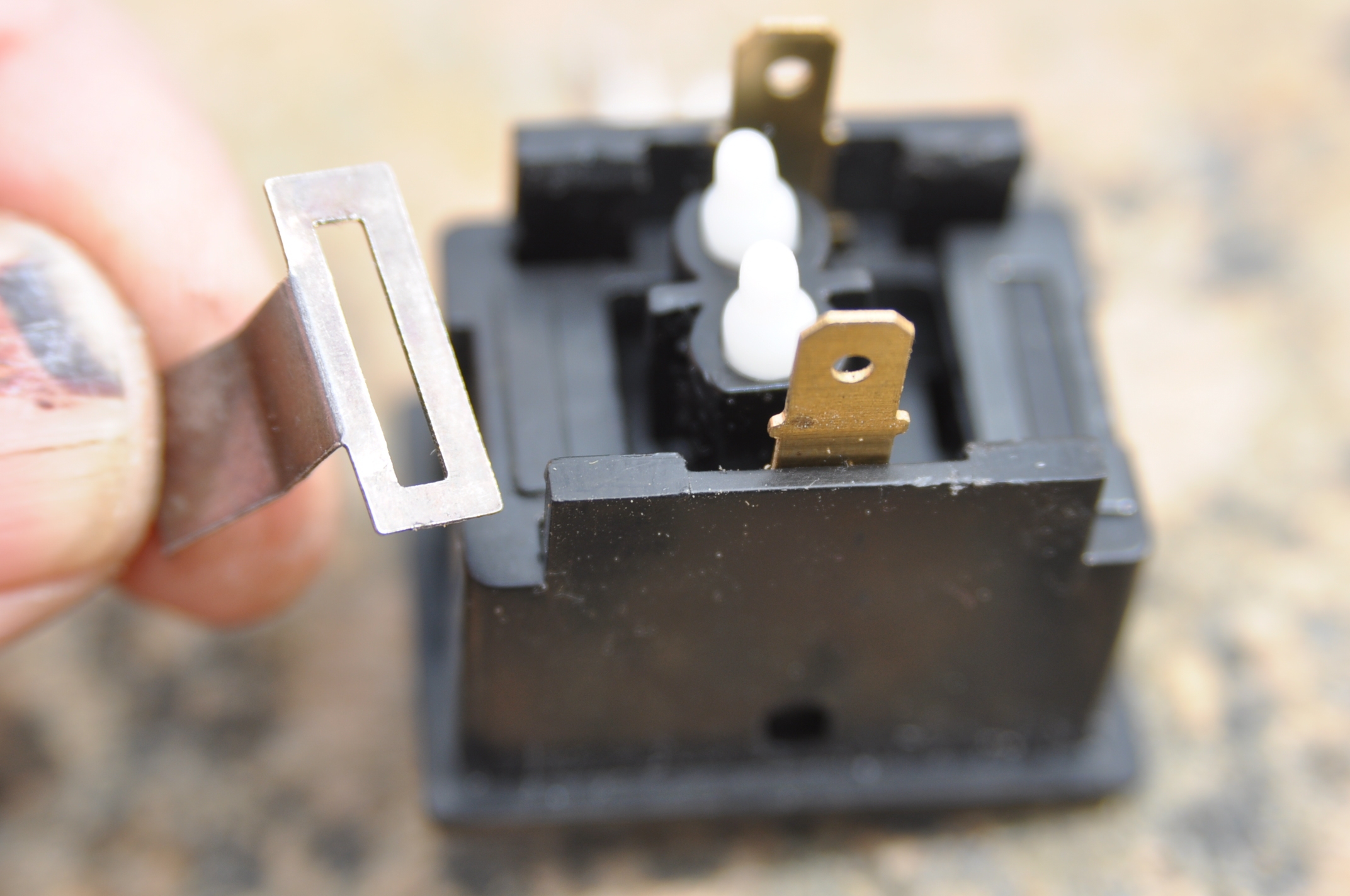 8 ) Partie mobile de commande, les deux tétouilles blanches sont montées sur ressort. Elles transmettent le mouvement, verrouillent dans une position et maintiennent la pression sur la bascule des contacts. Les deux petites cosses non standard sur les cotés, sont destinées au voyant du bouton lorsqu'on active les feux de détresse.