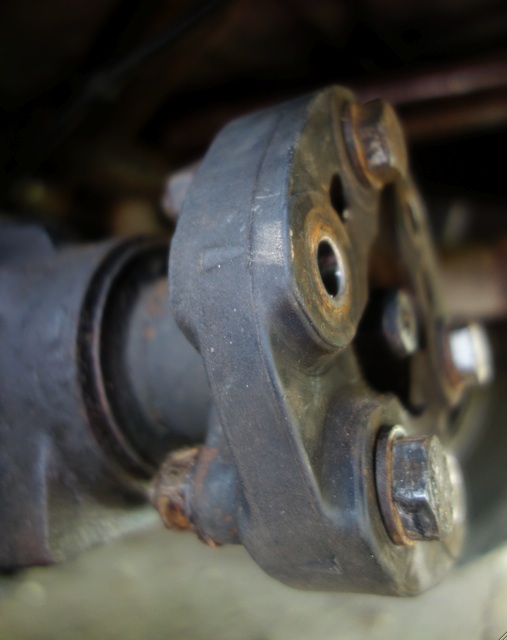 Pour démonter l"arbre AR dépose les 4 écrous du tambour, les 3 boulons qui fixent les "branches" de l'arbre au flector, comprime le coulisseau coté tambour pour dégager le cardan de ses 4 vis, abaisse l'arbre sous le tambour et tire le vers l'avant pour dégager l"autre bout de l"arbre de son roulement situé au milieu du flector.![]()