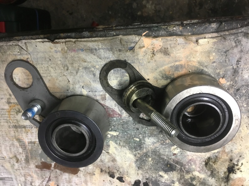 AMHA, Fais le nouveau montage, avec la petite vis.Pour le galet tendeur je n'étais pas certain de son montage. En prenant les mesures (photo ci-dessus), j'en ai déduit le même montage que l'origine, c'est-à-dire avec sa rondelle fendue et la longue vis.