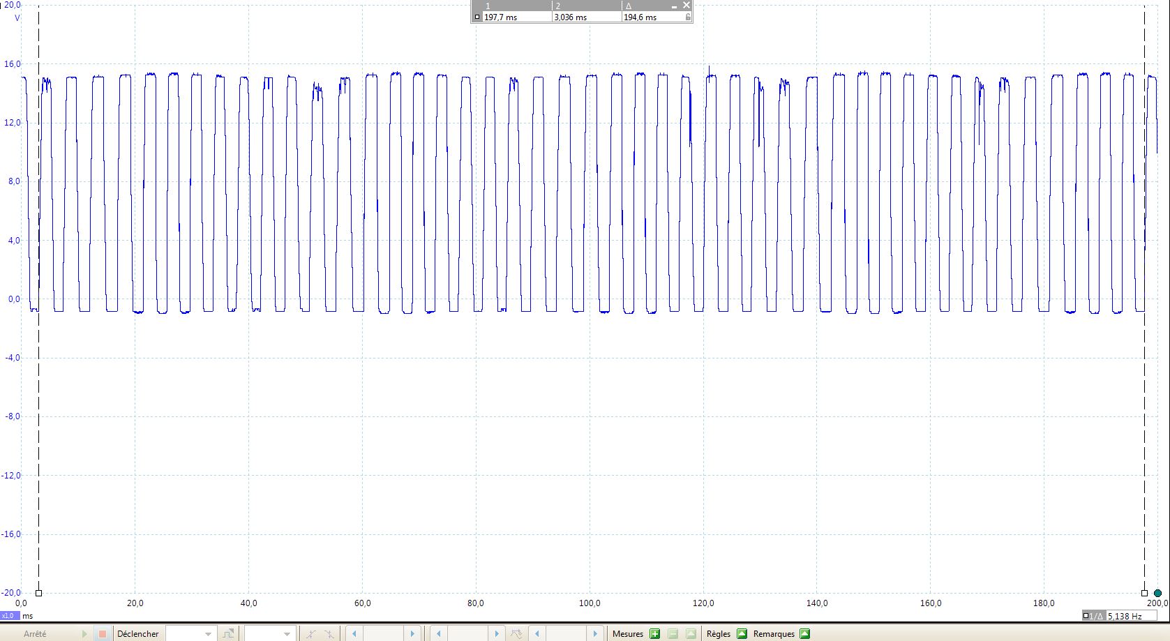 - 194,6 ms pour 45 impulsions soit une fréquence de 231,6 Hz à la borne de l'alternateur ;