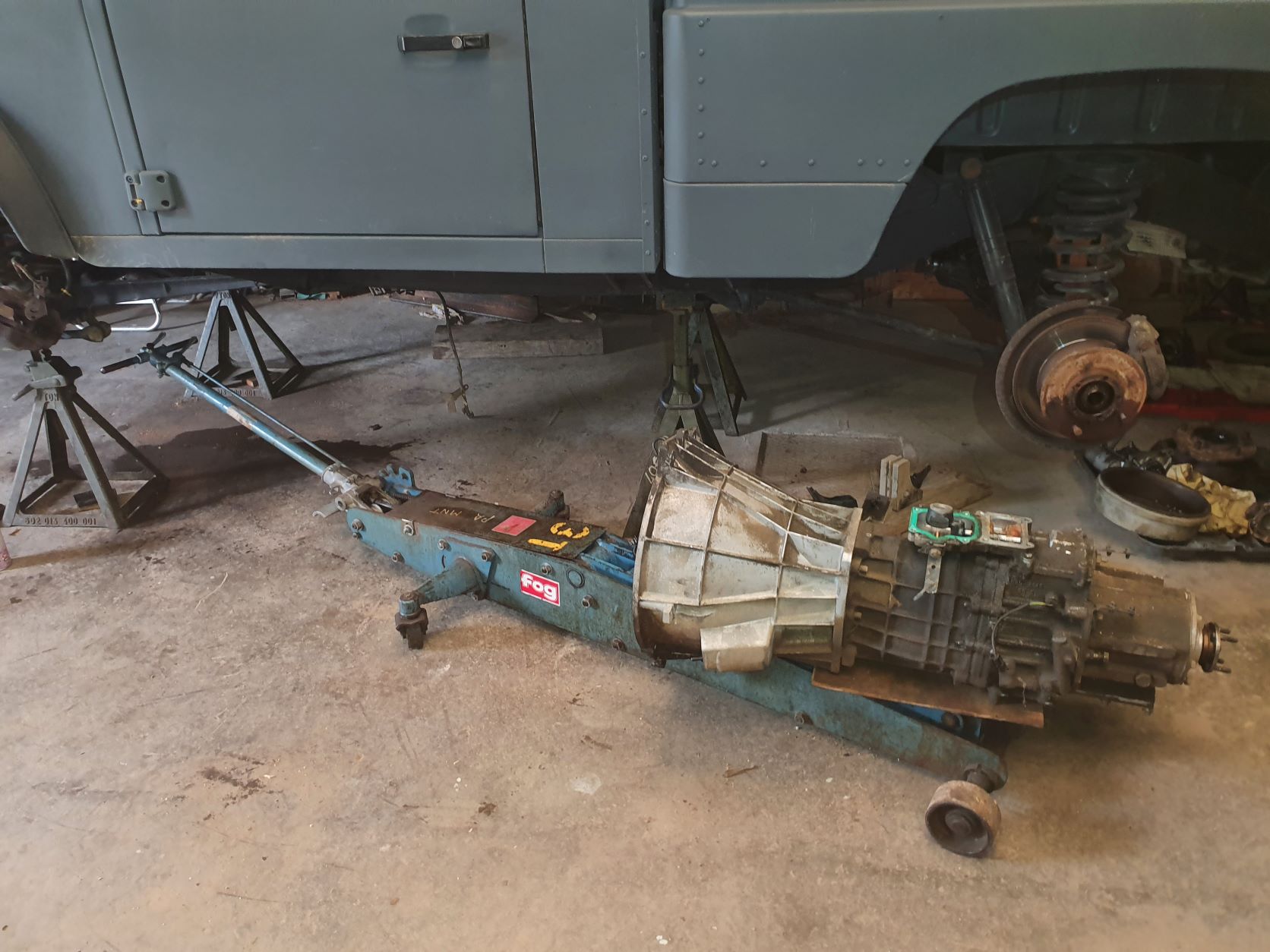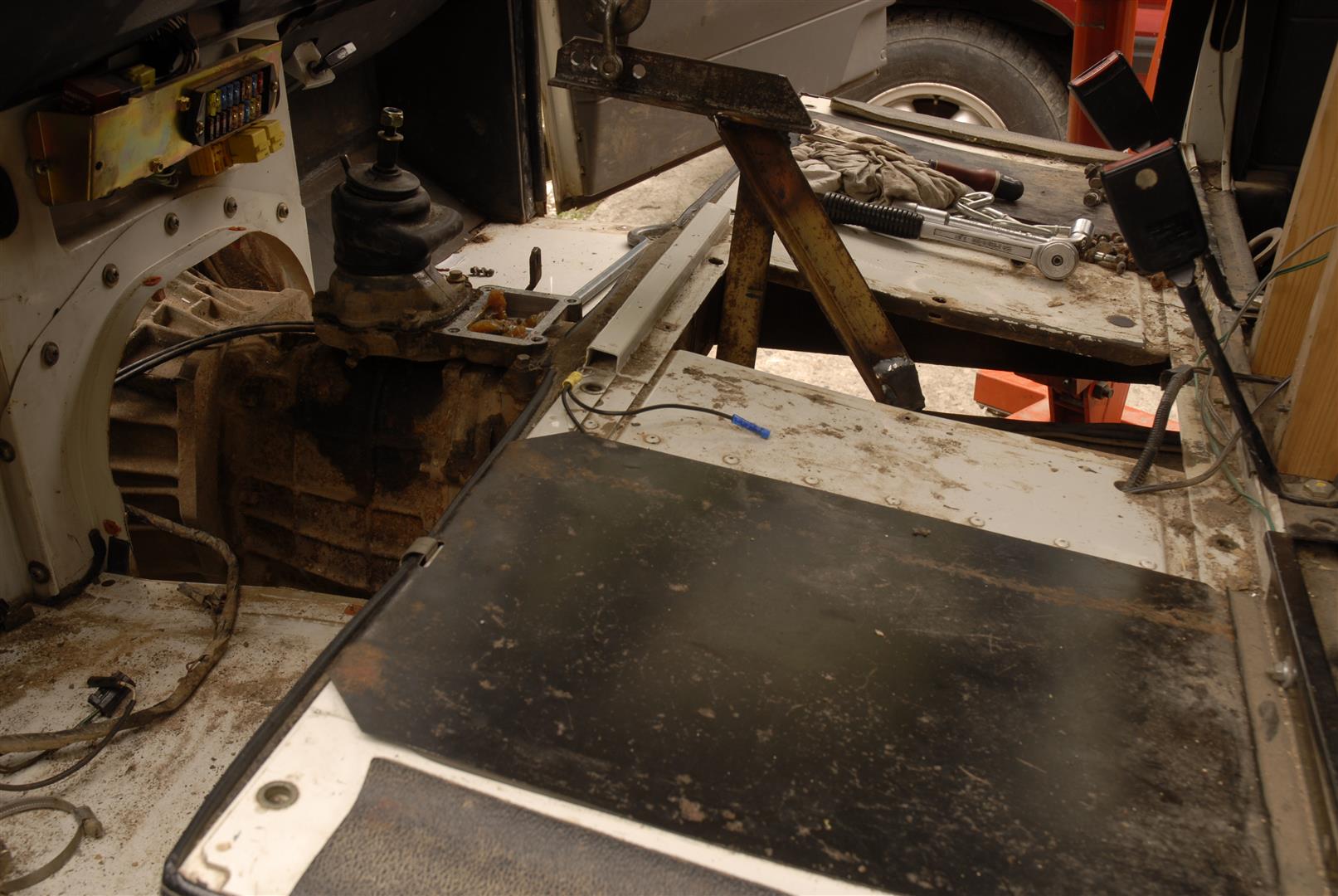 Pour la descente de la BT, j'ai tout fait seul et n'ayant pas de chèvre (super recette de kébir de tu as une chèvre !), j'avais viré le siège central pour passer un petit palan à chaine supporté par une poutre posée sur 2 tréteaux de maçon (après retrait des portières évidemment !). Ainsi, j'ai pu travailler seul et en sécurité.